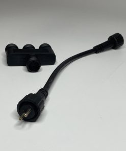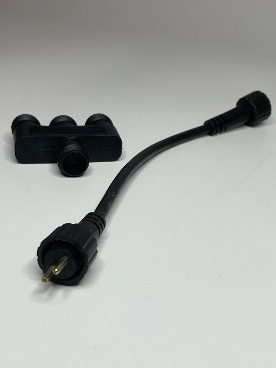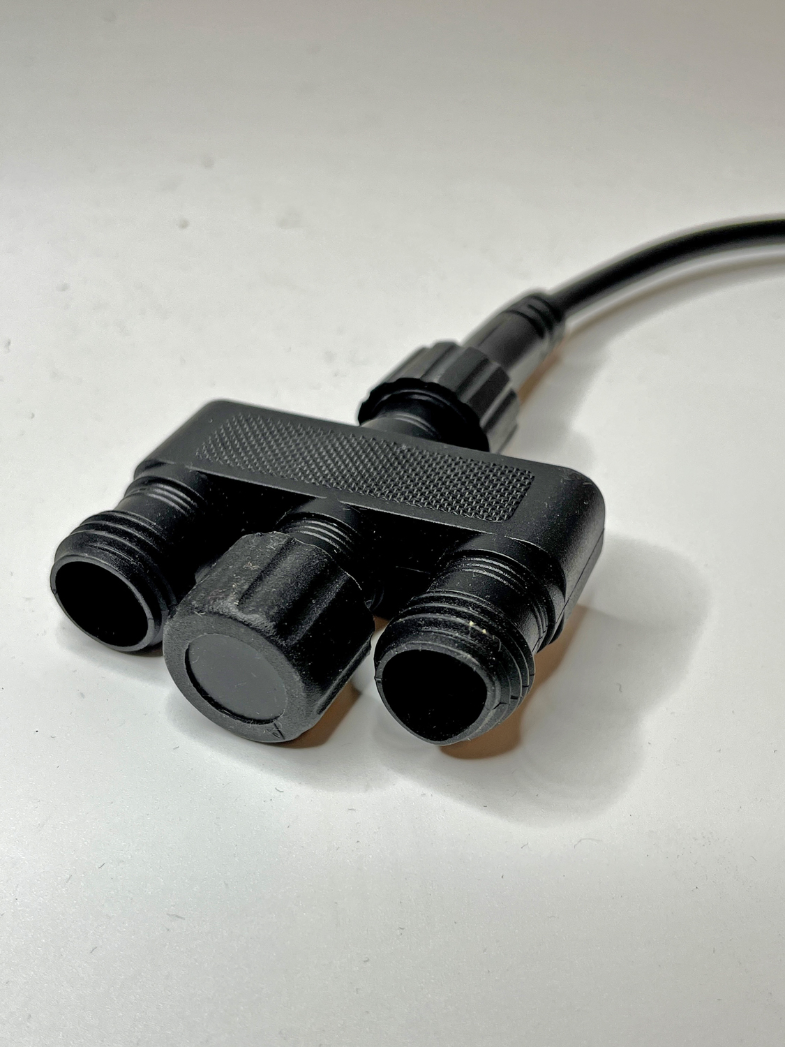 3fach-Verteiler zum Anschluss von bis zu 3 Geräten an ein Netzgerät und ausgestattet mit einem “2-Pin-Stecker” (mit Überwurfmutter).