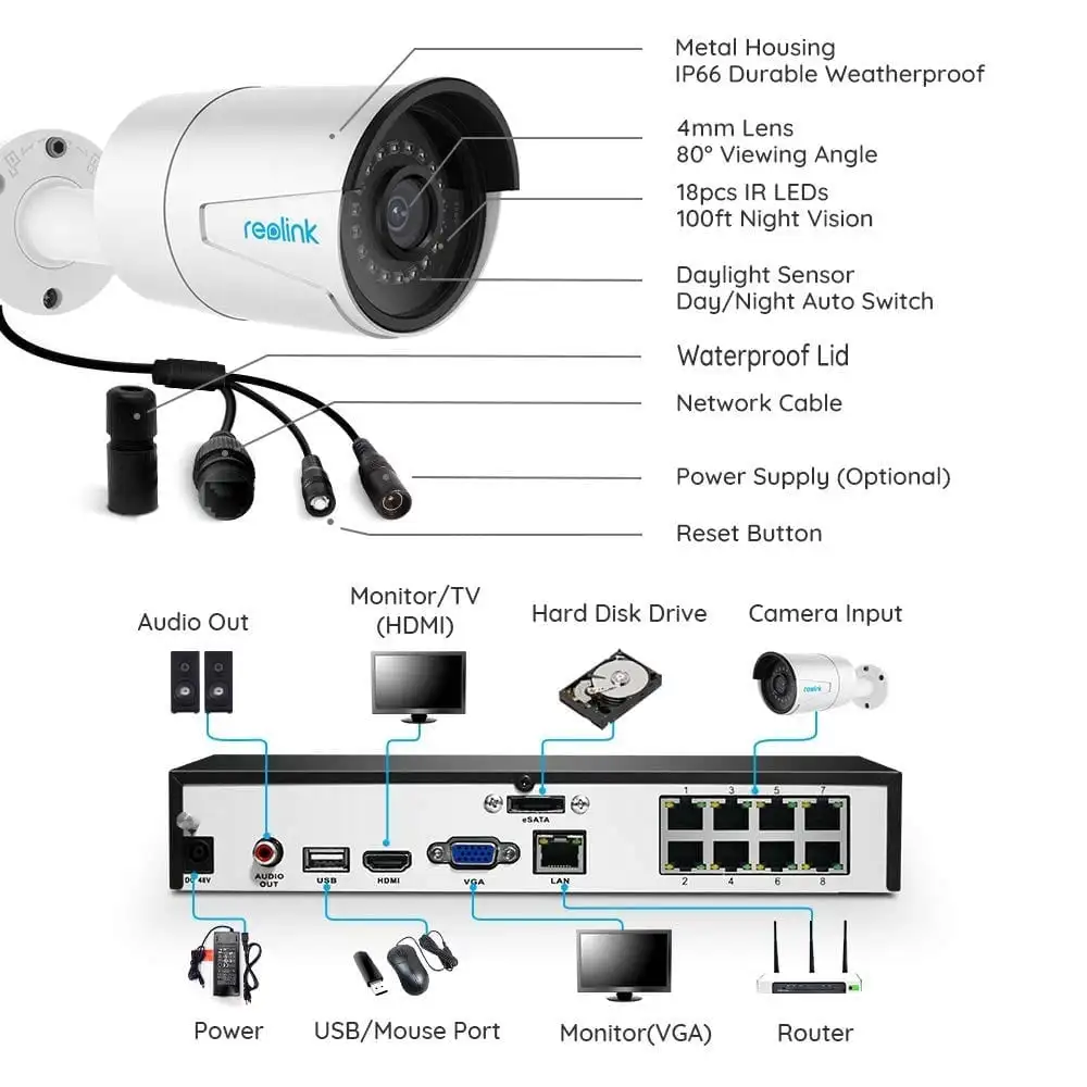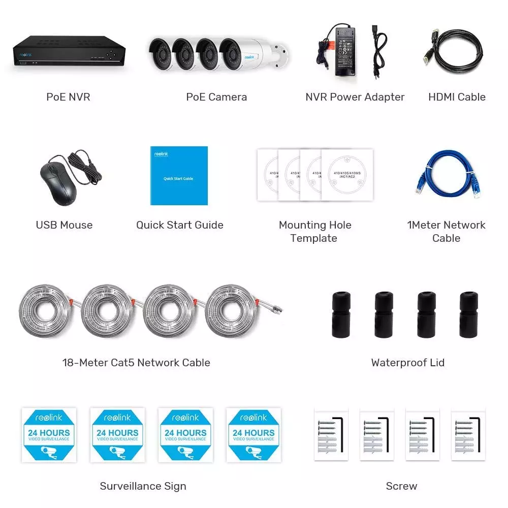 Funktioniert mit allen 4MP und 5MP Kameras von Reolink Dieses Kamerasystem kann mit allen Reolink IP-Kameras zusammenarbeiten, unabhängig davon, ob es PoE- oder WiFi-Kams mit Fest- oder Zoomobjektiv für Innen- oder Außenbereiche sind, einschließlich der Kameratypen RLC-410, 420, 411, 422, 423, 410WS, 411WS, 422W und 423WS. Dieses System funktioniert NUR zusammen mit Reolink Markenkameras und nicht mit Kameras anderer Marken.