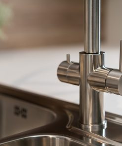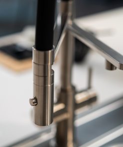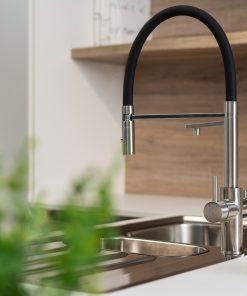 Extra lange Panzerflex Anschluss-Schläuche: 450 mm mit 3/8″ Mutter und eingesetzter 3/8″ Dichtung um die Installation zu vereinfachen. Die Panzerflex Anschluss-Schläuche sind DVGW KTW A1 zertifiziert. Fixierset der Armatur Typ “FIX & LOCK” um diese bombenfest auf Ihrer Spüle zu montieren. Dank unserer Technik können sie von Hand die Fixier-Mutter fixieren und anschließend mit einem ganz normalen Kreuzschlitz-Schraubendreher die Armatur befestigen.