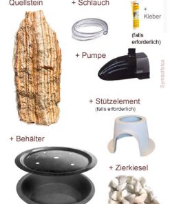 Um den Stein gegen eventuelles Kippen zu sichern ist im Lieferumfang des Quellsteines eine Kartusche (435g) eines Polymerklebers enthalten mit dem man den Quellstein mit dem Untergrund verkleben kann. Zum Auftragen des Klebers wird eine handelsübliche Silikonpistole benötigt, welche nicht im Lieferumfang enthalten ist.