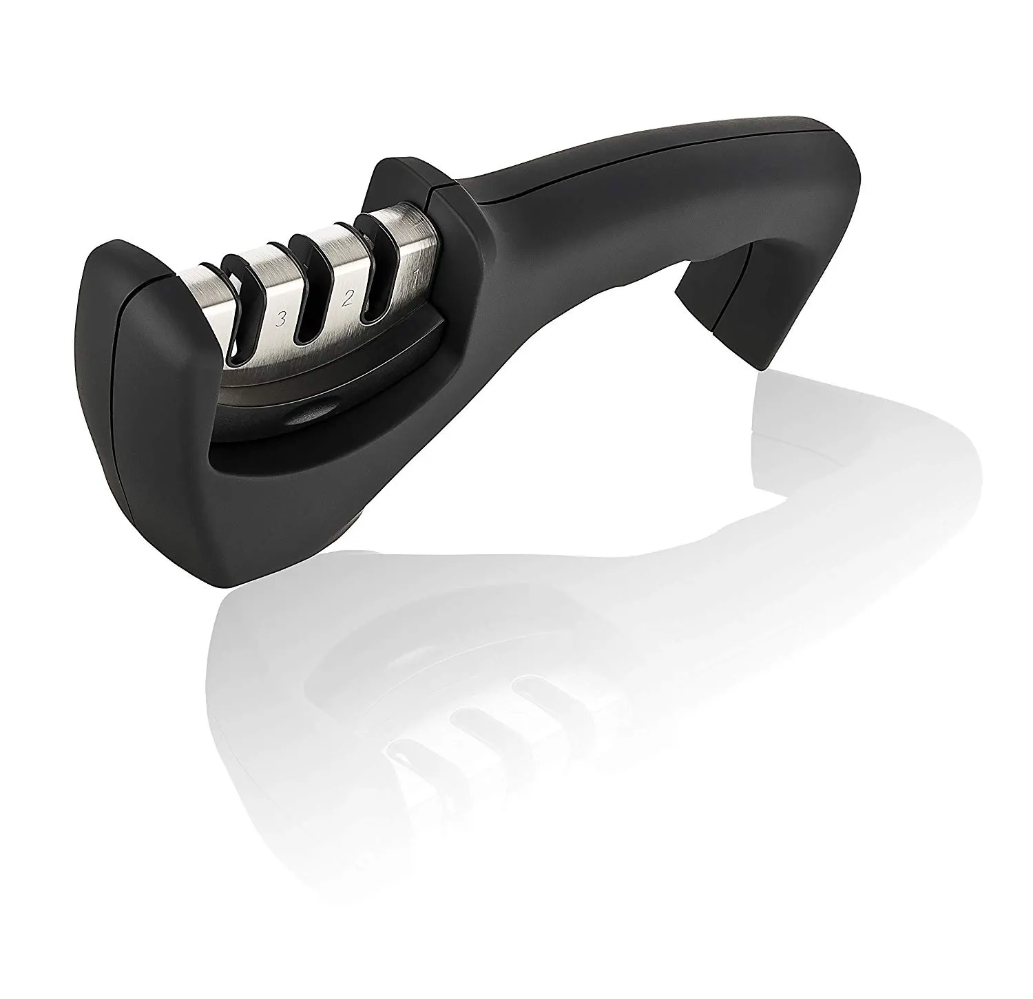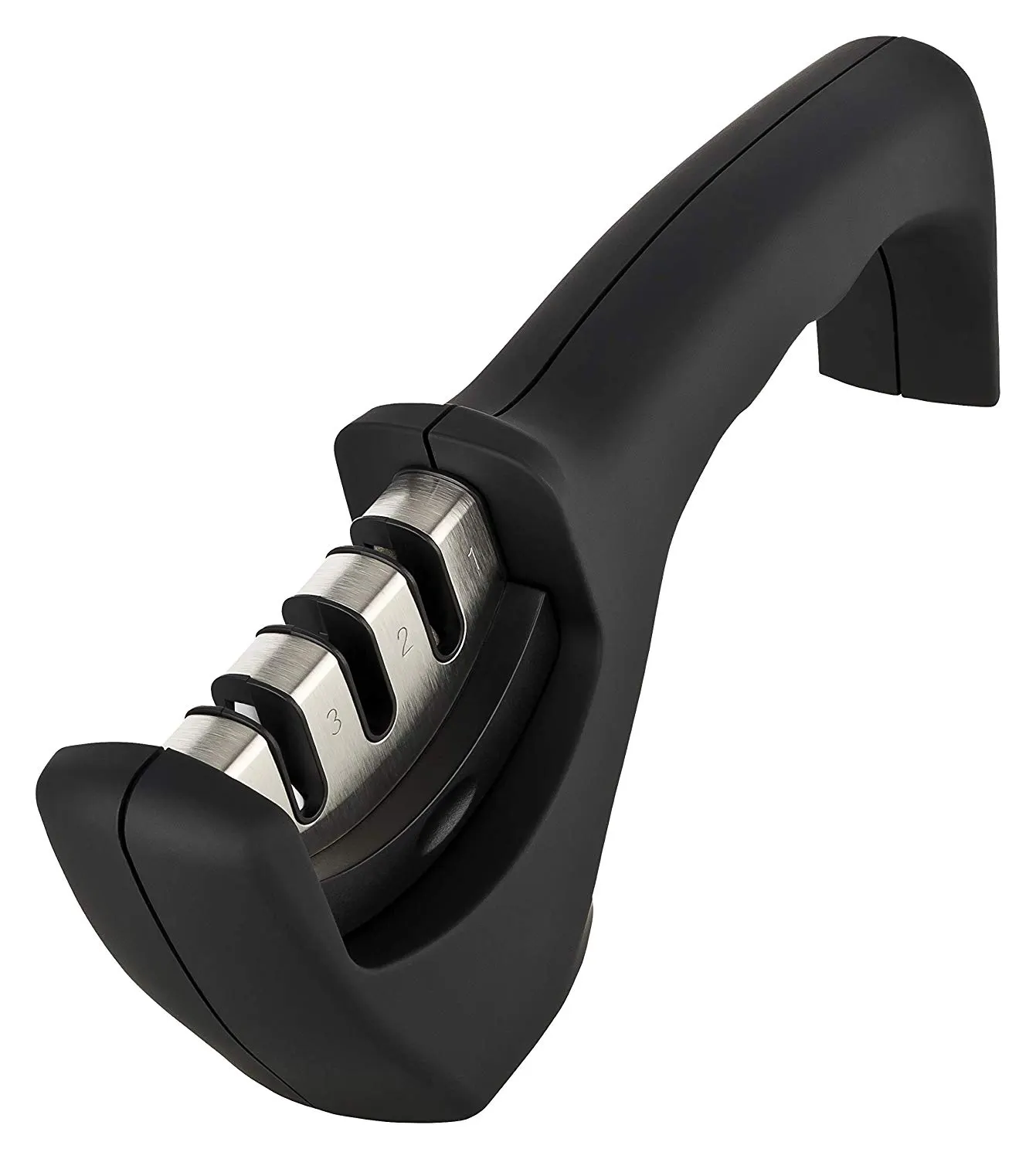 Dieses Produkt kostet nicht viel, wird für Sie aber immer wieder eines der nützlichsten Utensilien in Ihrer Küche erweisen. Denn dieser besonders handliche Messerschleifer bringt Ihre Messer immer wieder auf Vordermann. Blitzschnell und ohne dass Sie grosse Muskelkraft einsetzen müssten. Ziehen Sie die Messer einfach locker durch die jeweils geeignete Kerbe, ein paar Mal nur in eine Richtung – fertig.[/vc_column_text][vc_empty_space height=“5px“][/vc_column][vc_column width=“1/3″][vc_column_text]