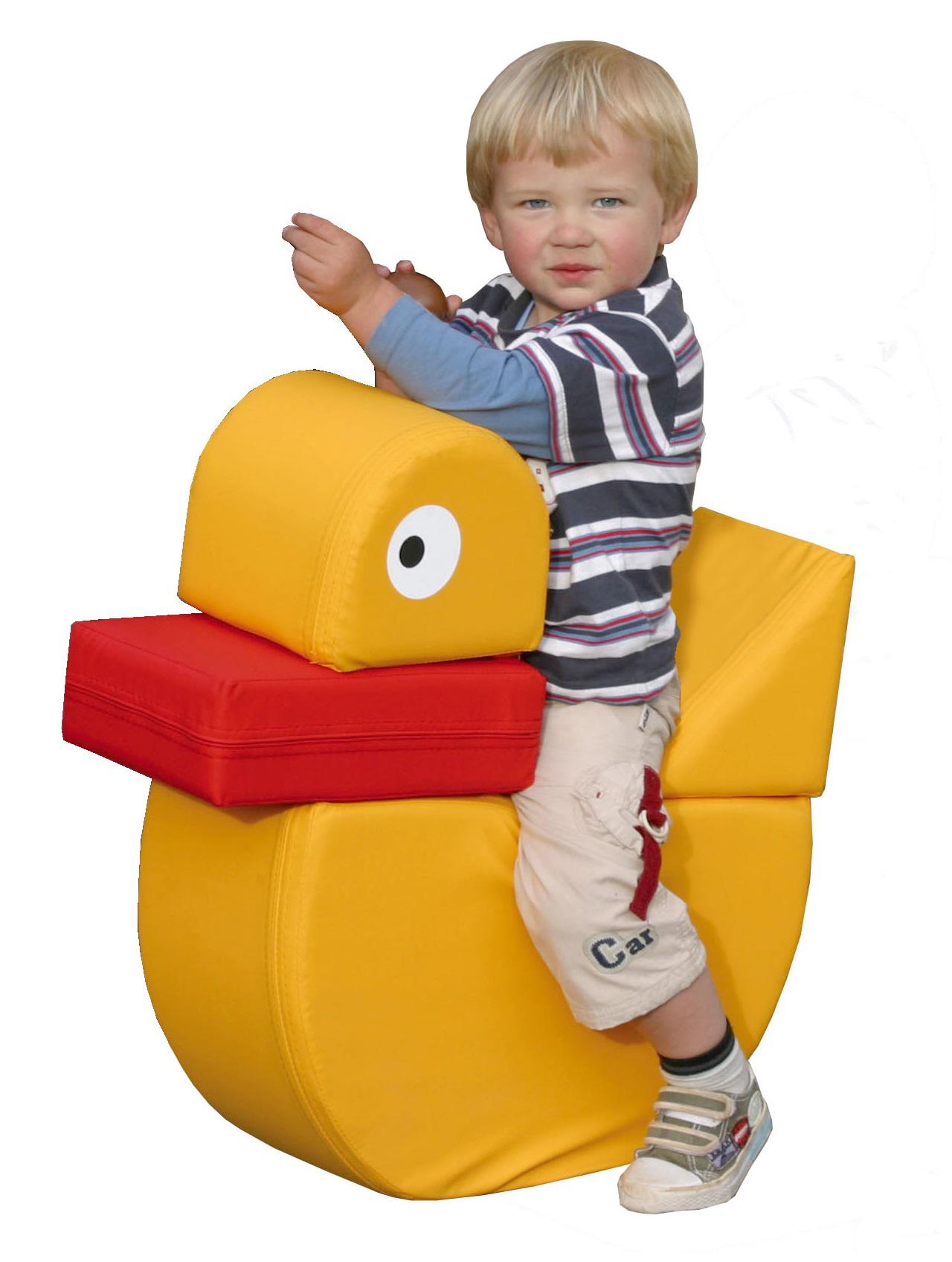 Elfi die Ente gehört zu den beliebten Spielfiguren aus Schaumstoff in Kindergärten und großen Spielräumen.
