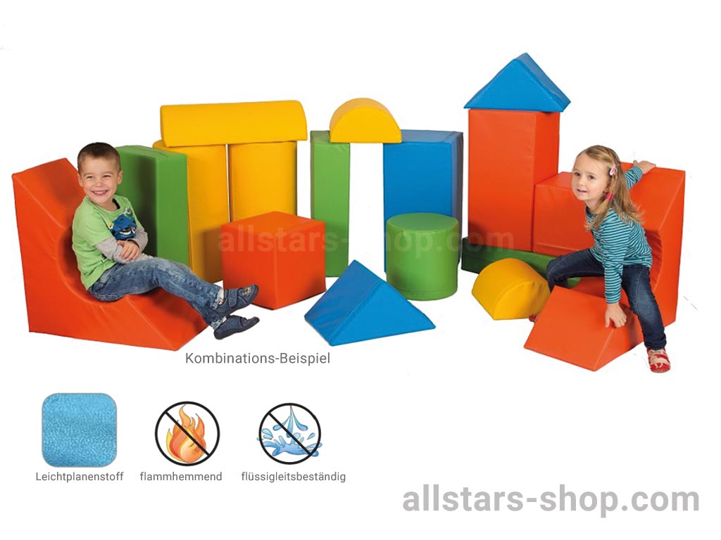 Diese Softbausteine gehören zu den beliebtesten Soft-Großbauklötzen – Therapiebausteinen – für Kindergärten und Kindertagesstätten, in großen Spielräumen jeglicher Art und Spielräumen in Einkaufsmärkten.
