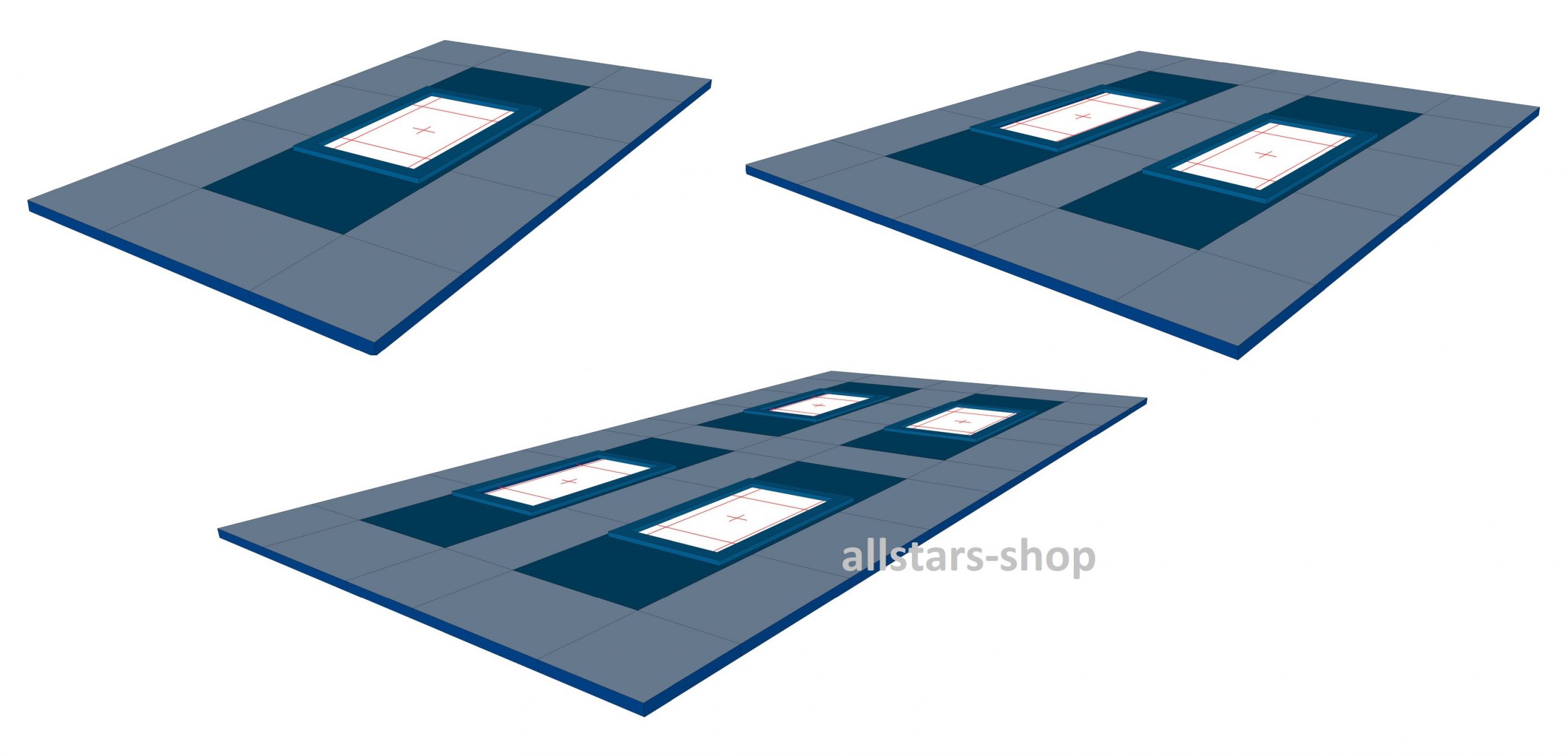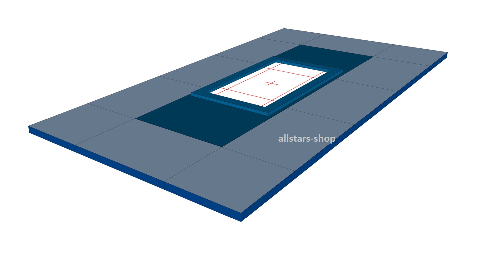 Der Mattensatz für Trampolin Großgeräte besteht aus Niedersprungmatten mit Sandwichkern und Trittverteilerplatte inkl. Randstabilisierung. Er ist zertifiziert und erfüllt die internationalen Anforderungen. Der Umrandungssatz besteht aus einem himmelblauem Nadelfilz (er ist ebenfalls mit einer Planenstoff-Hülle erhältlich).