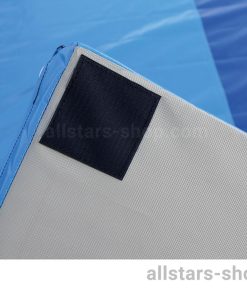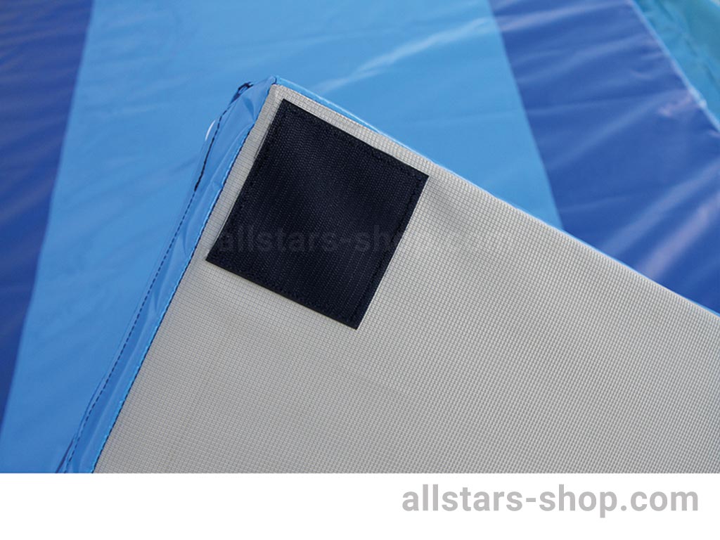 Die Auflage wurde nach FIG-Norm gefertigt. Der Bezug besteht aus Planenstoff (oben und seitlich) und Turnmattenstoff (unten). Die Unterseite wurde außerdem mit Hakenbändern versehen um die Matte fest mit einer Niedersprungmatte verbinden zu können.