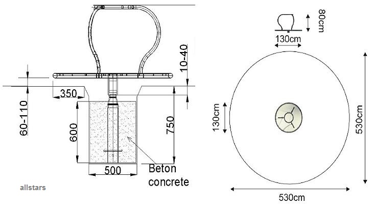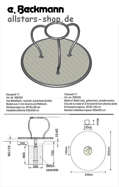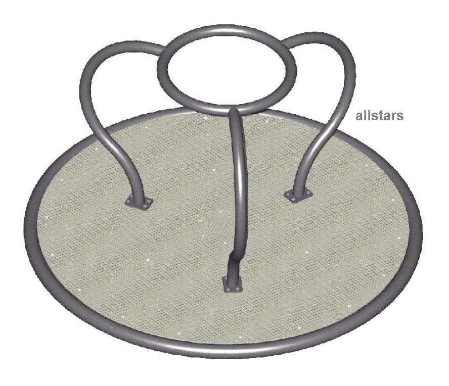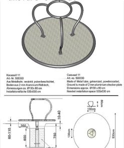 Das Stehkarussell besteht aus verzinkten und pulverbeschichteten Metallrohren. Der rutschhemmende Boden ist aus 2 mm Riffelblech gefertigt. Es ist für hohe Belastungen konstruiert und perfekt für den öffentlichen Bereich geeignet.