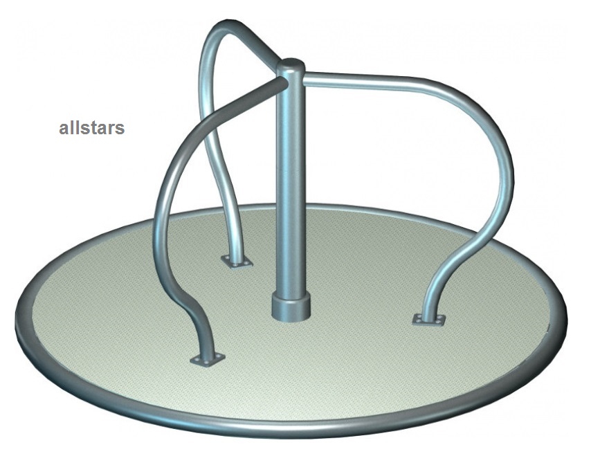 Das Stehkarussell besteht aus verzinkten und pulverbeschichteten Metallrohren. Der rutschhemmende Boden ist aus 2 mm Riffelblech gefertigt. Es ist für hohe Belastungen konstruiert und perfekt für den öffentlichen Bereich geeignet.
