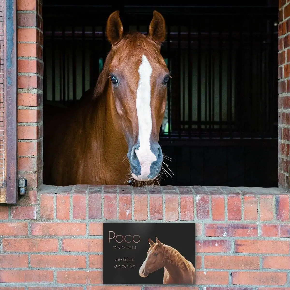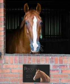 Gestalte ein ganz individuelles Pferde Boxenschild mit Foto aus Alu Dibond für Deinen Lieblingsvierbeiner. Denn jedes Pferd hat seinen ganz eigenen Charakter und eine einzigartige Persönlichkeit – genauso einzigartig sollte auch sein Pferdeboxenschild sein. So mancher hat einen kleinen Sturkopf im Stall stehen, ein anderer eine liebenswerte Zimtzicke und der nächste einen absoluten Chaoten. Egal, ob verfressen, temperamentvoll oder Schlafmütze – jede kleine Macke macht unsere Pferde doch gerade so besonders. Gerade deswegen solltest Du auch beim Boxenschild für Deinen treuen Vierbeiner auf Individualität setzen. Gestalte für ihn ein unvergleichliches Pferdeschild mit Foto aus hochwertigem Alu Dibond, welches seine Box zum Blickfang der Stallgasse macht.