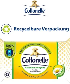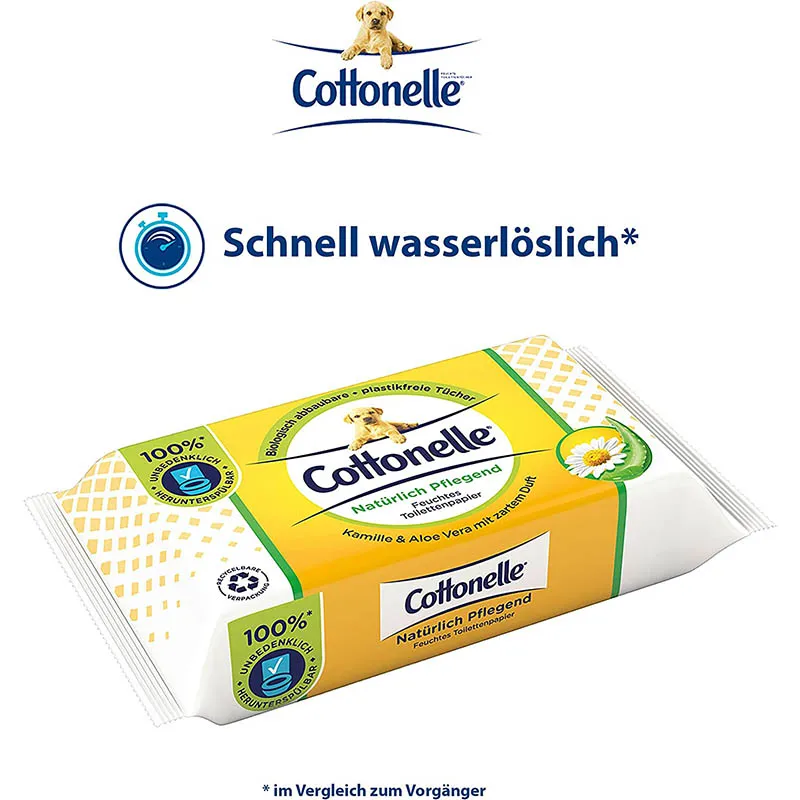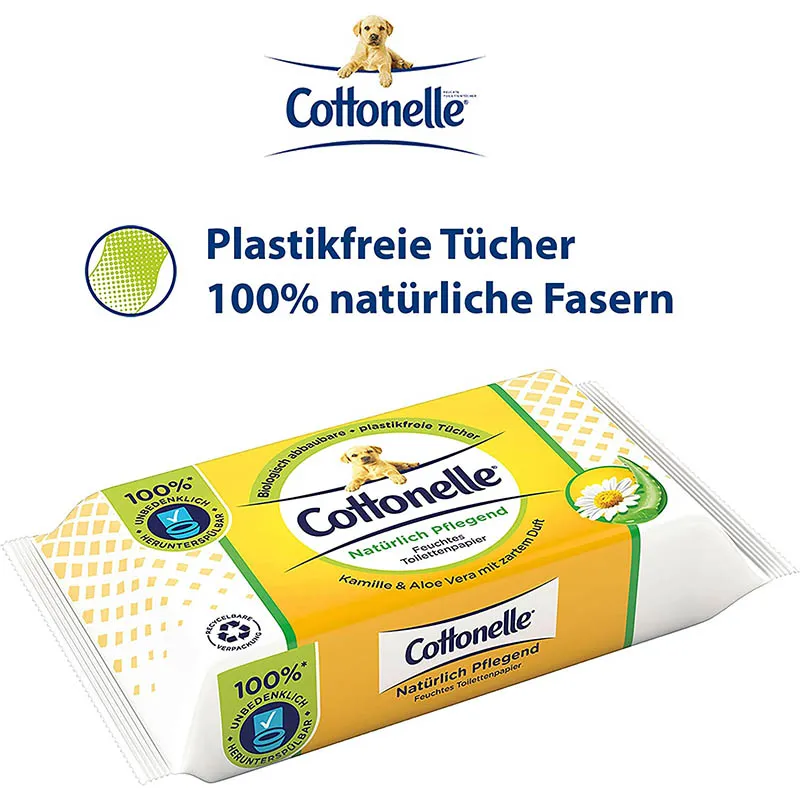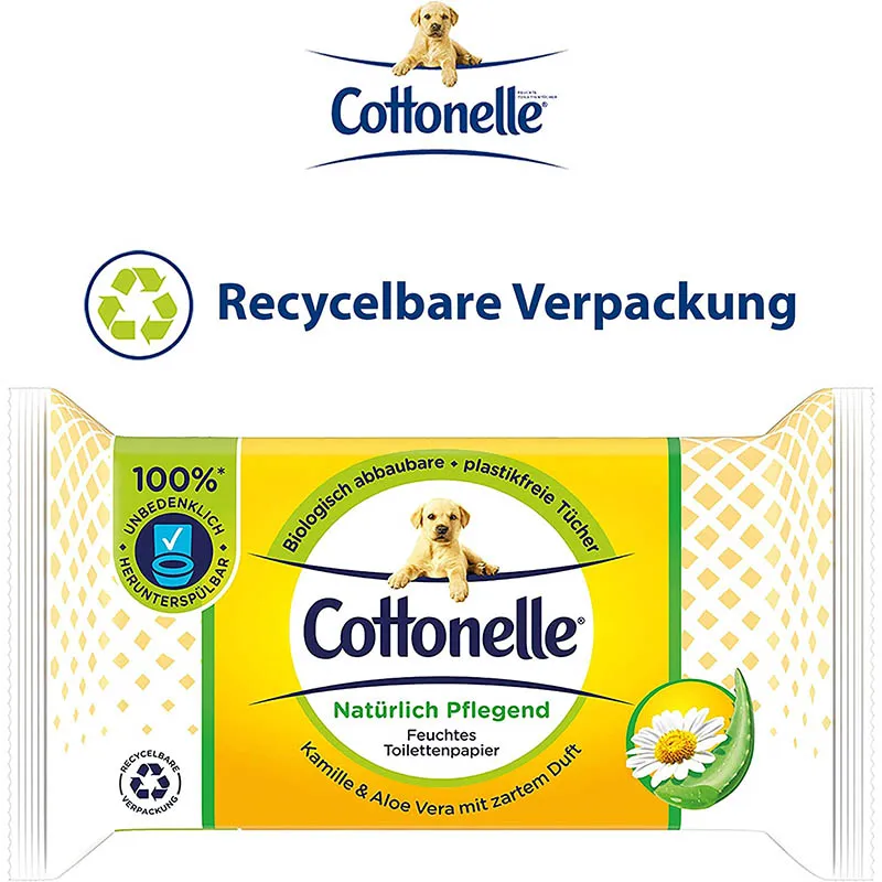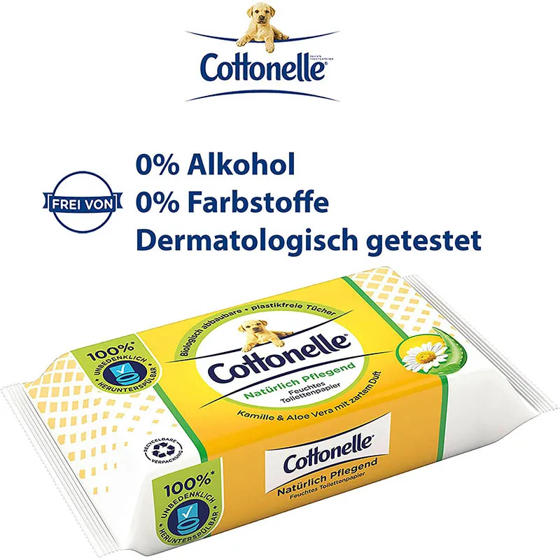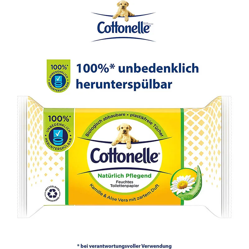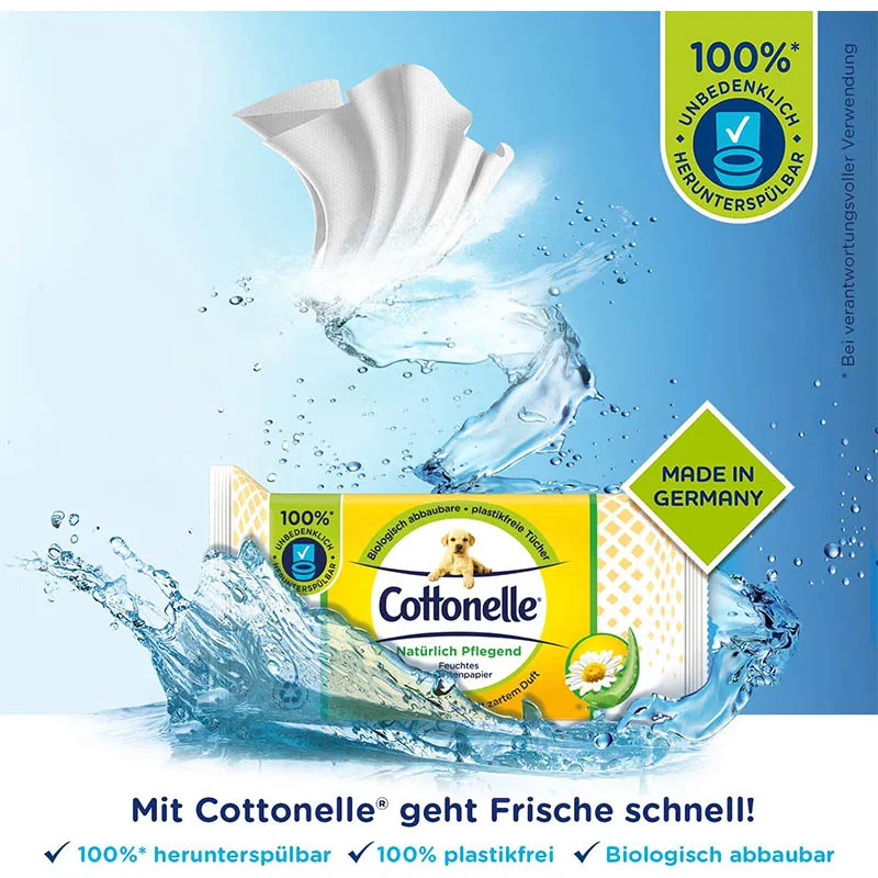 Das feuchte Toilettenpapier von Cottonelle löst sich schnell im Wasser auf und kann deshalb ohne Bedenken in der Toilette heruntergespült werden. Bei verantwortungsvoller Verwendung verstopft es die Toilette nicht und ist sicher für die Kanalisation. Unser Toilettenpapier ist plastikfrei und FSC-zertifiziert. Ausserdem schützt die luftdichte, komplett recycelbare Verpackung mit wiederverschliessbarem Feuchtigkeitssiegel die Tücher vor dem Austrocknen. Alle Cottonelle Produkte sind pH-neutral, alkohol- und farbstofffrei, für eine angenehme Anwendung. Der Zusatz von Kamille und pflegendem Aloe Vera sorgt für extra Frische und ein Plus an Pflege. Dank der verschiedenen, stilvollen Designs und wohltuenden Düfte können Sie die Toilettentücher in jedem Badezimmer oder auf jeder Bürotoilette platzieren. Geniessen Sie das wunderbare Gefühl von Sauberkeit und Frische!