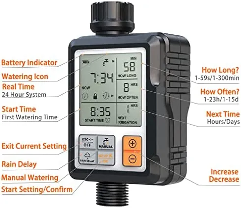 CROSOFMI Sprinkler-Timer bietet einfache Installation, flexible Programmierung und automatische Bewässerung, einfach zu bedienen, einfach einzustellen. Sie können einfach die aktuelle Uhrzeit, Startzeit, Bewässerungsdauer, Bewässerungshäufigkeit, Regenverzögerung und manuelle Bewässerung nach Ihren Bedürfnissen im Grossen und Ganzen einstellen Wähltasten (Manuelle Bewässerungsdauer: 1-99 Min.). Das grosse Display ist gut lesbar und erleichtert die Bewässerungseinstellung.