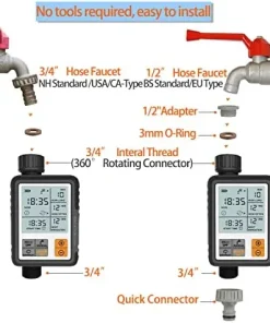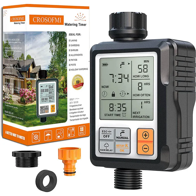 Die CROSOFMI Regnerzeitschaltuhr zeichnet sich durch einfache Installation, flexible Programmierung und automatische Bewässerung aus. Sie können einfach die aktuelle Uhrzeit, Startzeit, Bewässerungsdauer, Bewässerungsfrequenz, Regenverzögerung und manuelle Bewässerung nach Ihren Bedürfnissen über die grossen Wahltasten einstellen. Das grosse 3″LCD Display ist leicht abzulesen und erleichtert die Einstellung der Bewässerung.