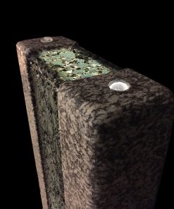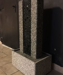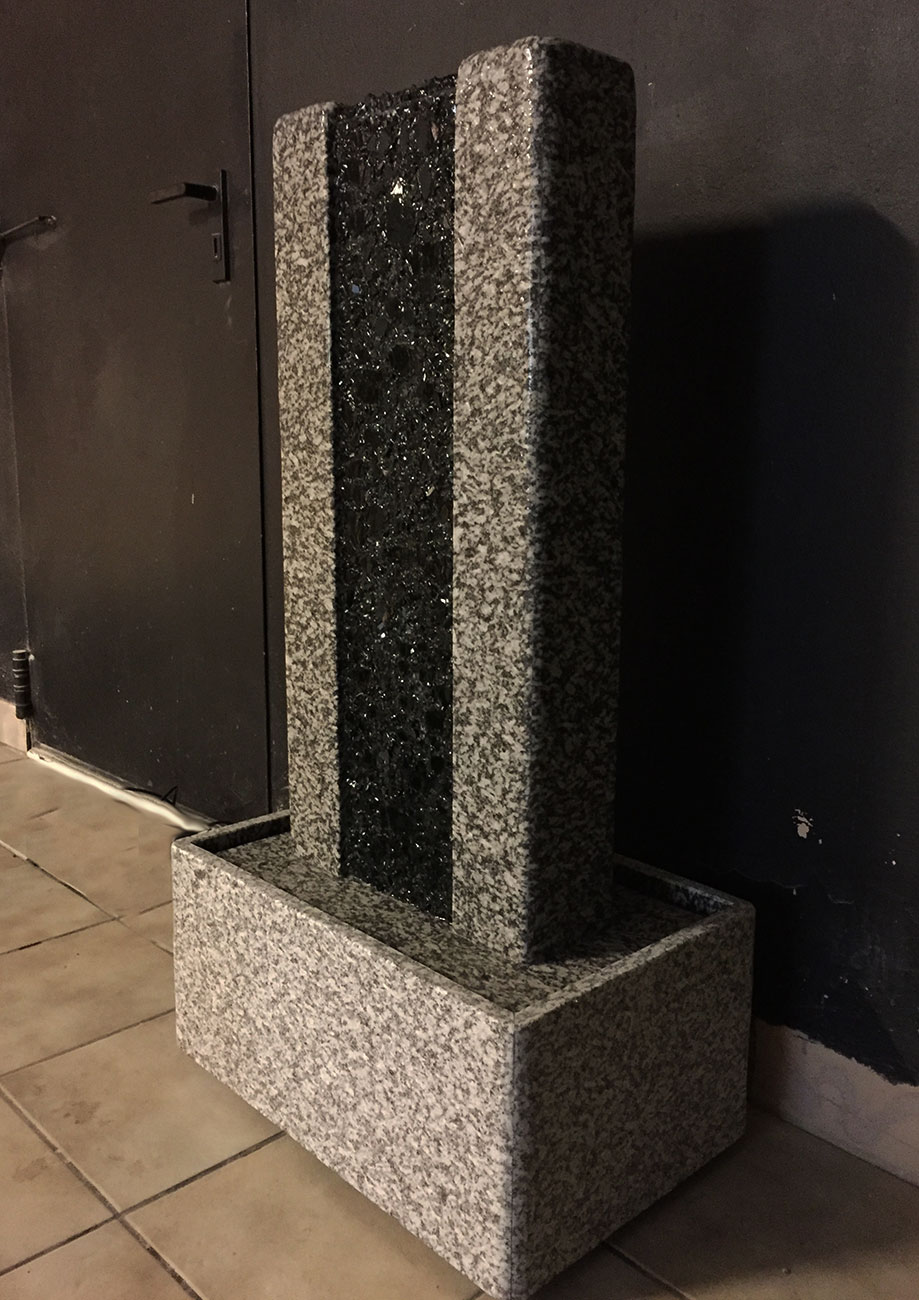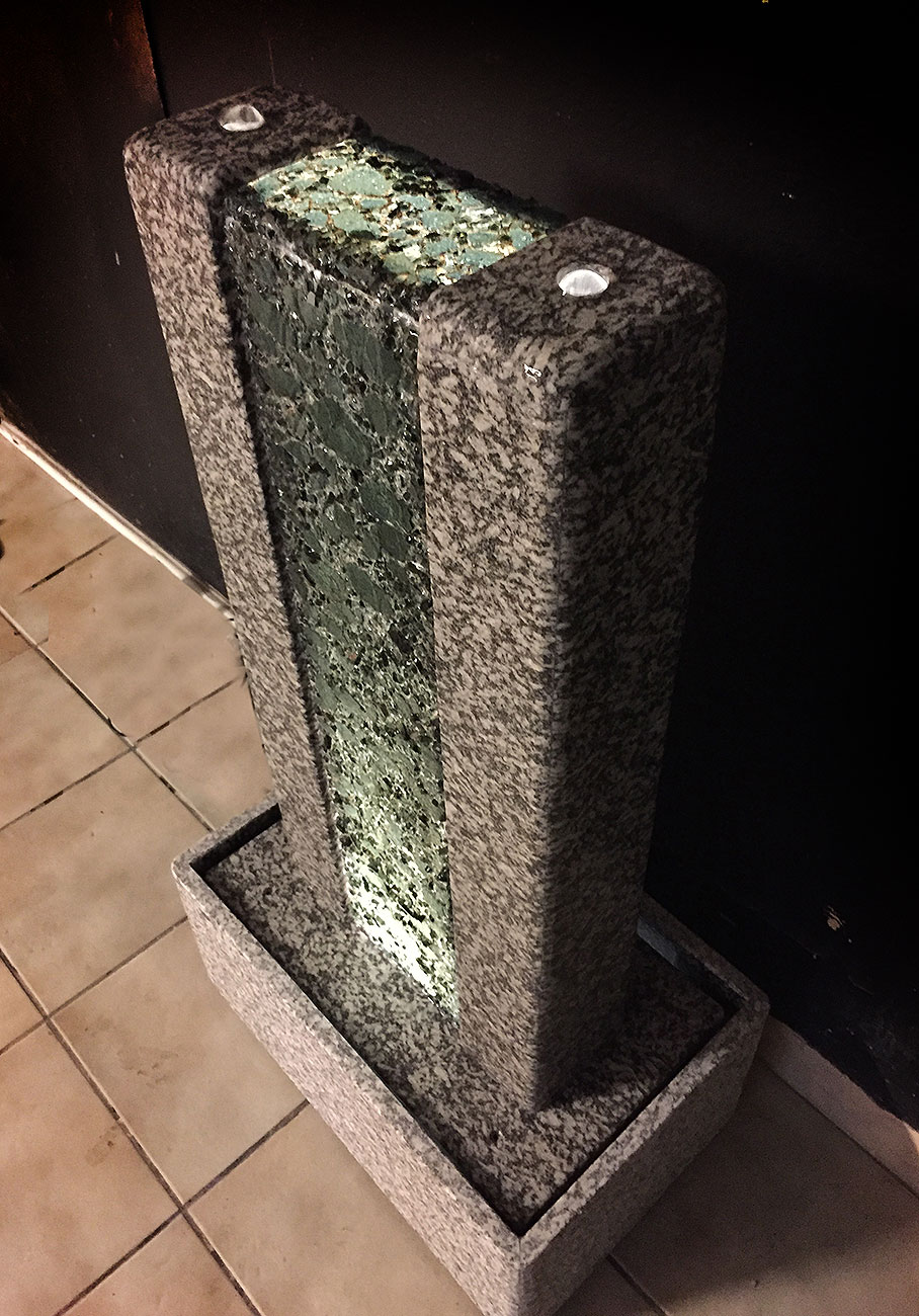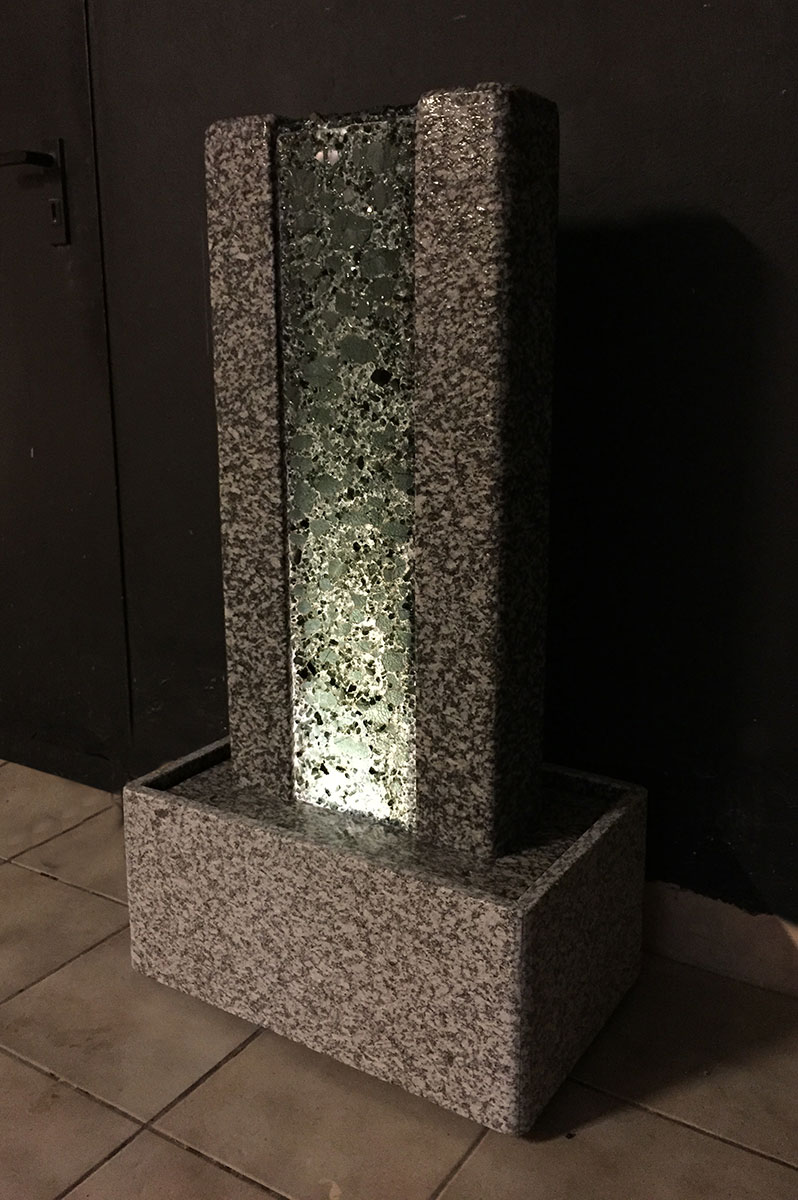 Der Brunnen besteht aus der Granit-Wanne und dem bewässerten Oberteil. Die leise und regulierbare Qualitäts-Pumpe, die über zwei Steigleitungen das Wasser kontinuierlich über die Wasserwand zirkulieren lässt, sowie der LED-Unterwasserscheinwerfer sind in der Granit-Wanne untergebracht.
