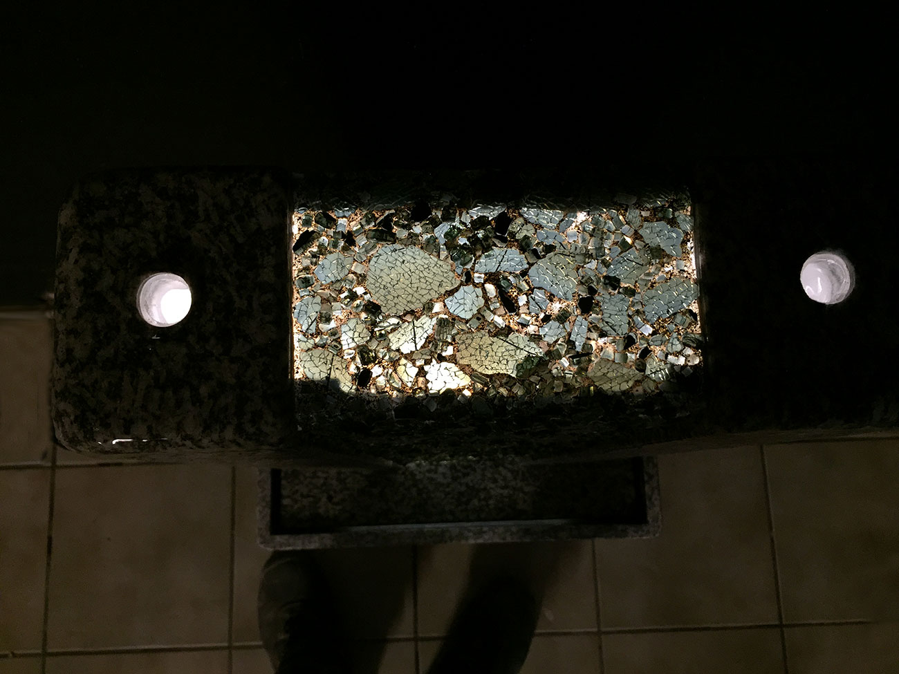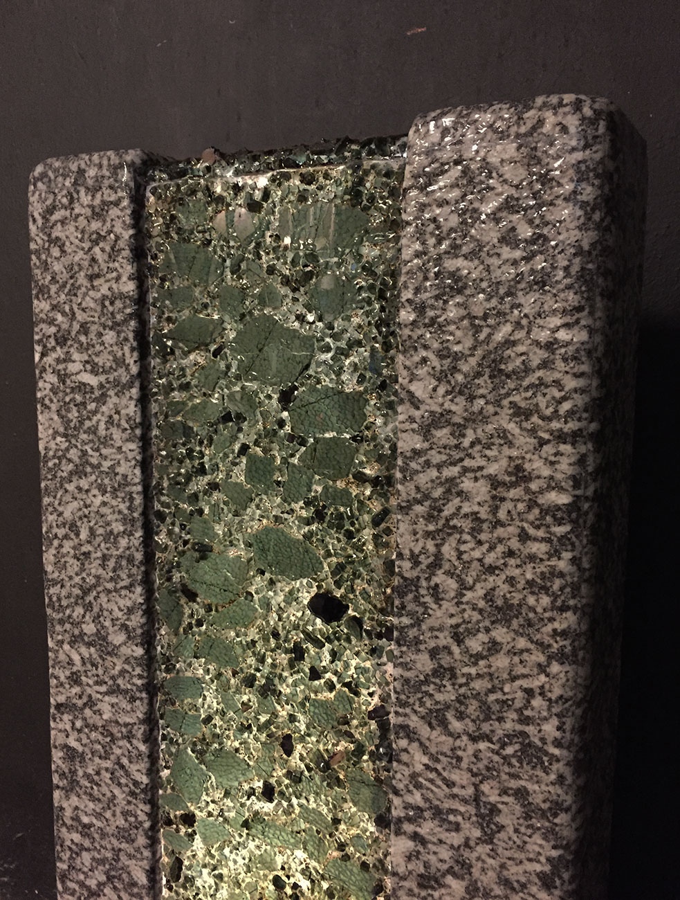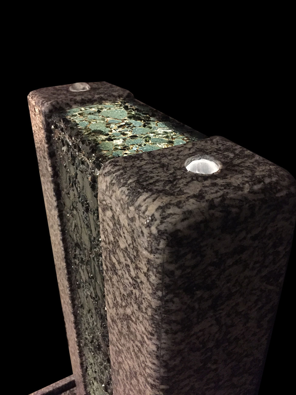 Dieser außergewöhnliche Designer-Brunnen verleiht jedem Raum ein ganz besonderes Flair. Das coole und moderne Design, made by Tröster’s Brunnenwelt, wurde aus dem Material Herschenberger-Granit und Glas in die Realität umgesetzt. Der Mittelstreifen, bestehend aus einer Acrylglasrückwand, belegt mit Sicherheitsglasscherben und Strahlkorrund, wird vom Innenraum mit einem LED-Scheinwerfer effektiv in Szene gesetzt und sorgt für mystische Lichteffekte. Schaltet man das Licht weg, so entsteht eine ganz andere, aber nicht minder interessante Optik. Das getönte Glas wirkt dann schwarz (siehe Abbildung 7 und 8) und stellt einen ebenso geschmackvollen Kontrast zum grau gesprenkelten Granit dar.