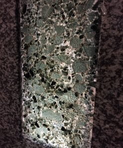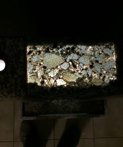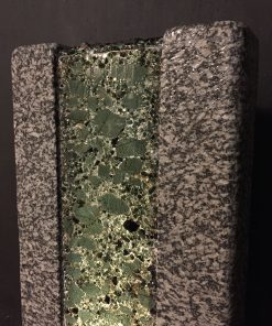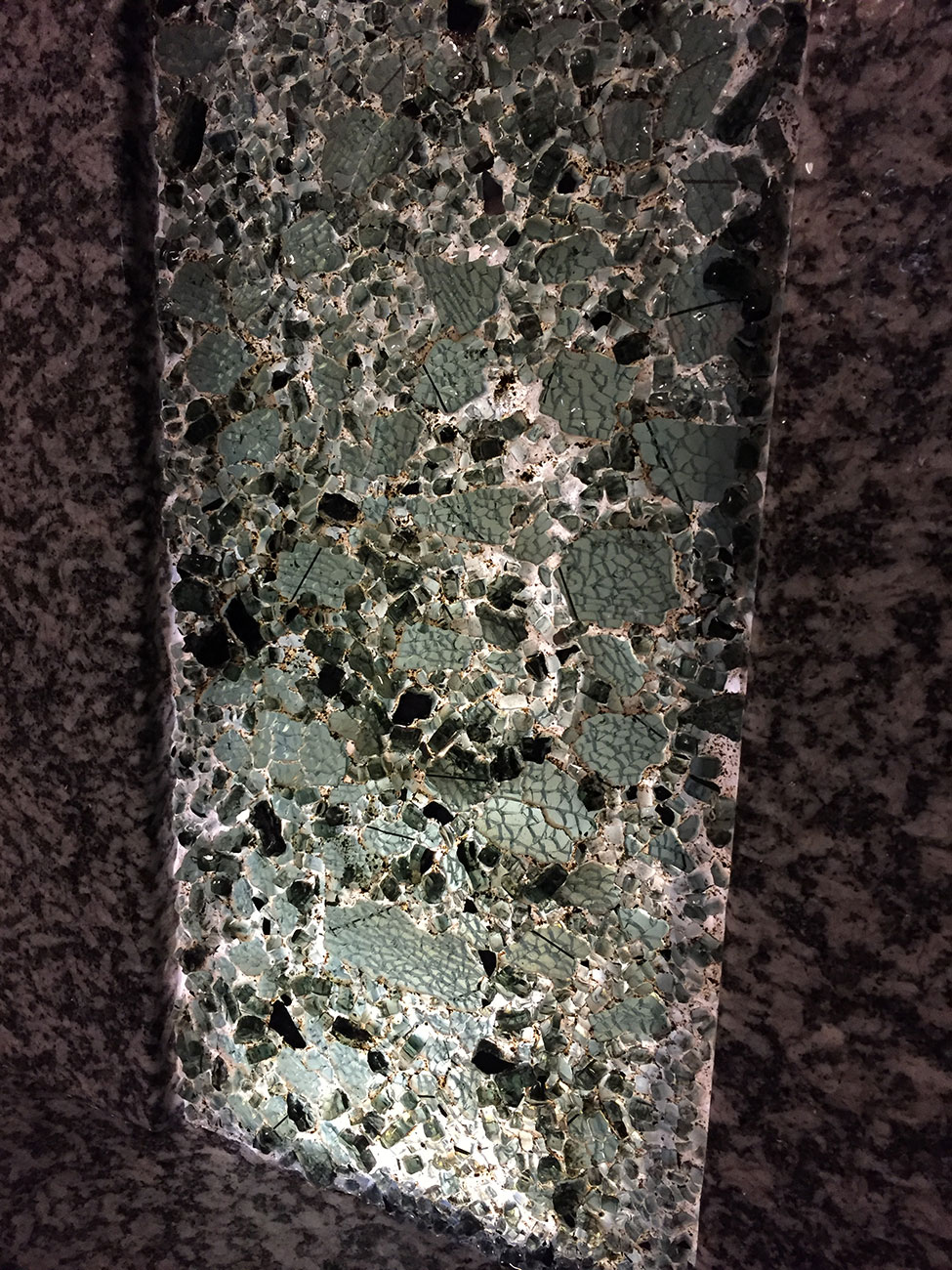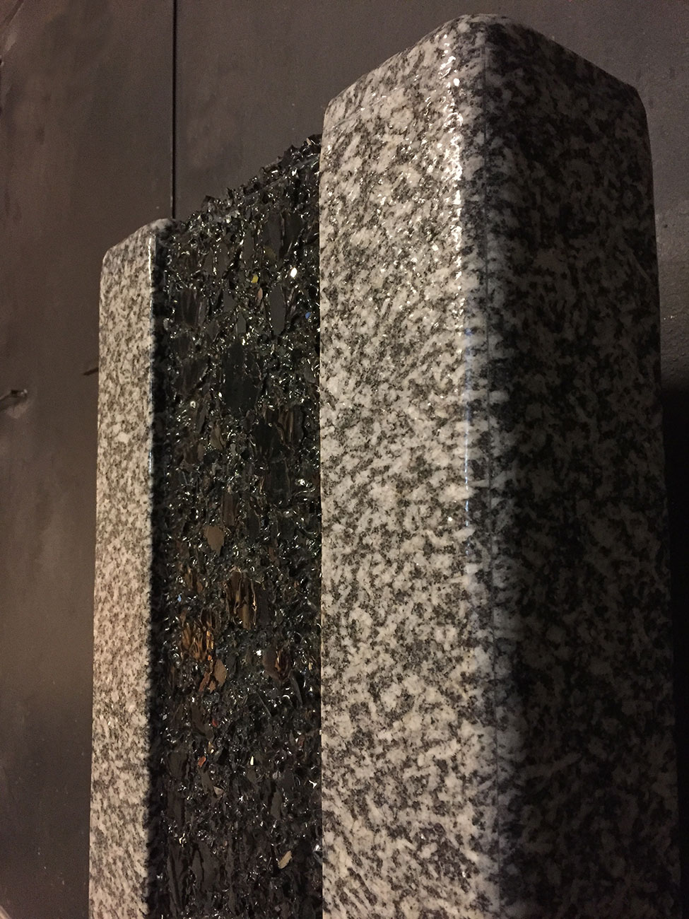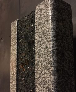 Dieser außergewöhnliche Designer-Brunnen verleiht jedem Raum ein ganz besonderes Flair. Das coole und moderne Design, made by Tröster’s Brunnenwelt, wurde aus dem Material Herschenberger-Granit und Glas in die Realität umgesetzt. Der Mittelstreifen, bestehend aus einer Acrylglasrückwand, belegt mit Sicherheitsglasscherben und Strahlkorrund, wird vom Innenraum mit einem LED-Scheinwerfer effektiv in Szene gesetzt und sorgt für mystische Lichteffekte. Schaltet man das Licht weg, so entsteht eine ganz andere, aber nicht minder interessante Optik. Das getönte Glas wirkt dann schwarz (siehe Abbildung 7 und 8) und stellt einen ebenso geschmackvollen Kontrast zum grau gesprenkelten Granit dar.