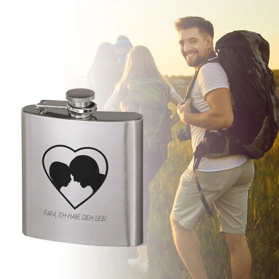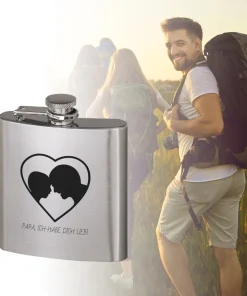 Mit diesem Flachmann aus Edelstahl hast du ein stilvolles und praktisches Geschenk für jeden Anlass, sei es zum Geburtstag oder zum Vatertag. Gerade auch für abenteuerlustige Freunde, z.B. Wanderer, Kletterer, Skifahrer, Camper, Angler oder als Jagdgeschenk ist der gravierte Flachmann super geeignet.