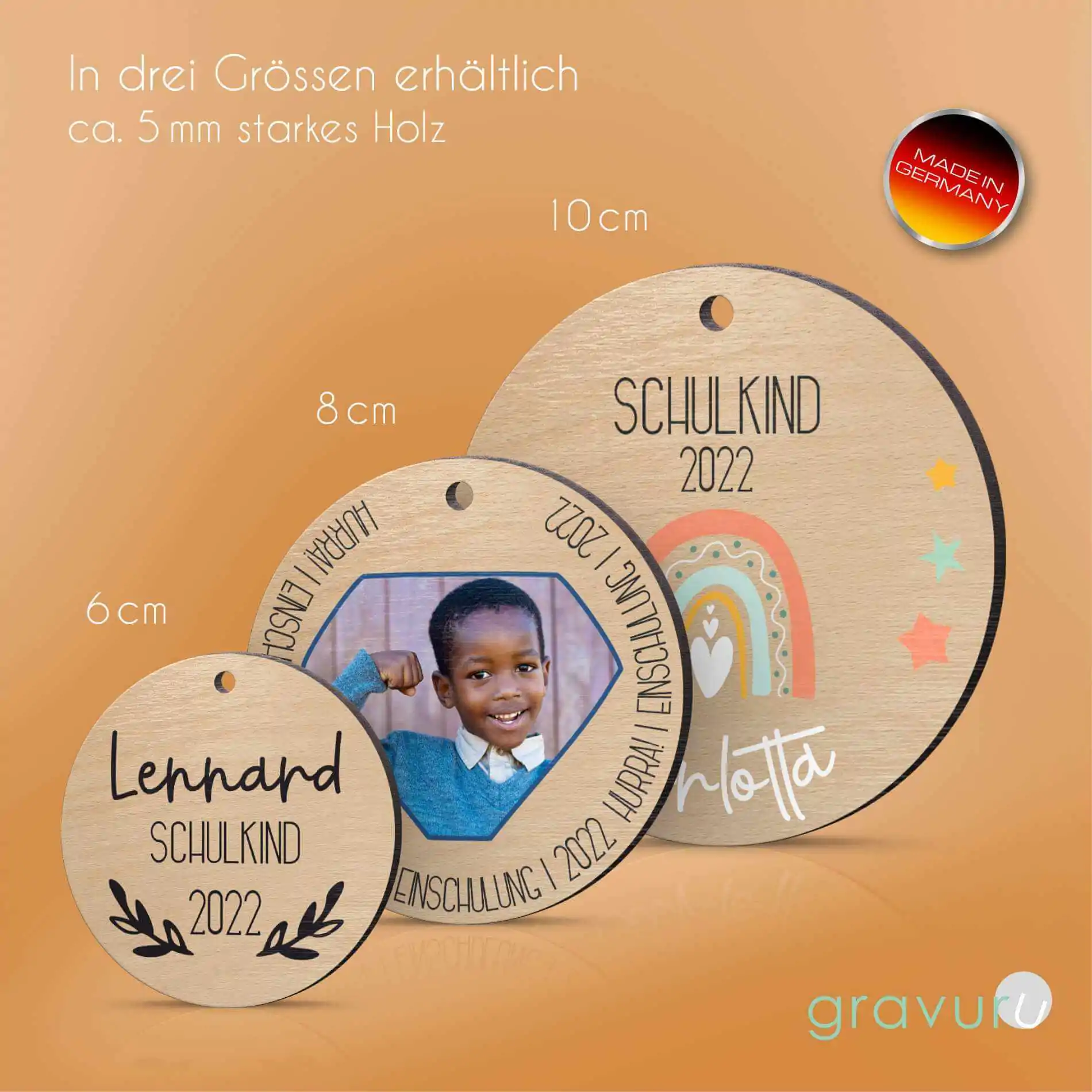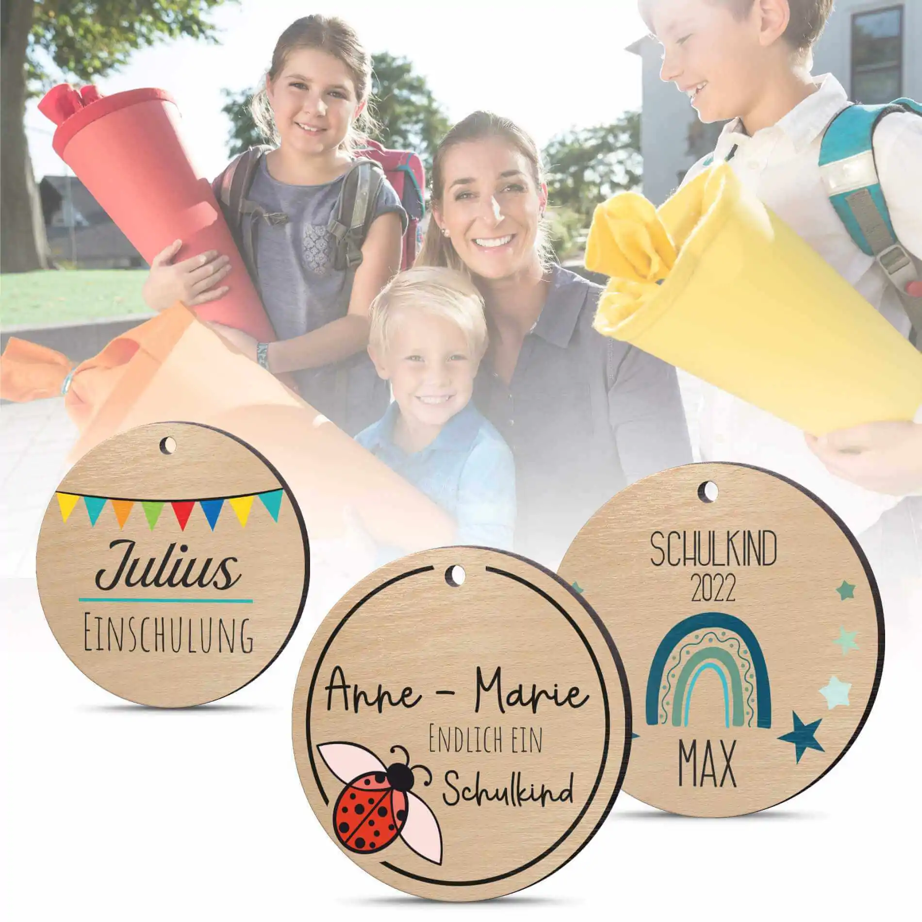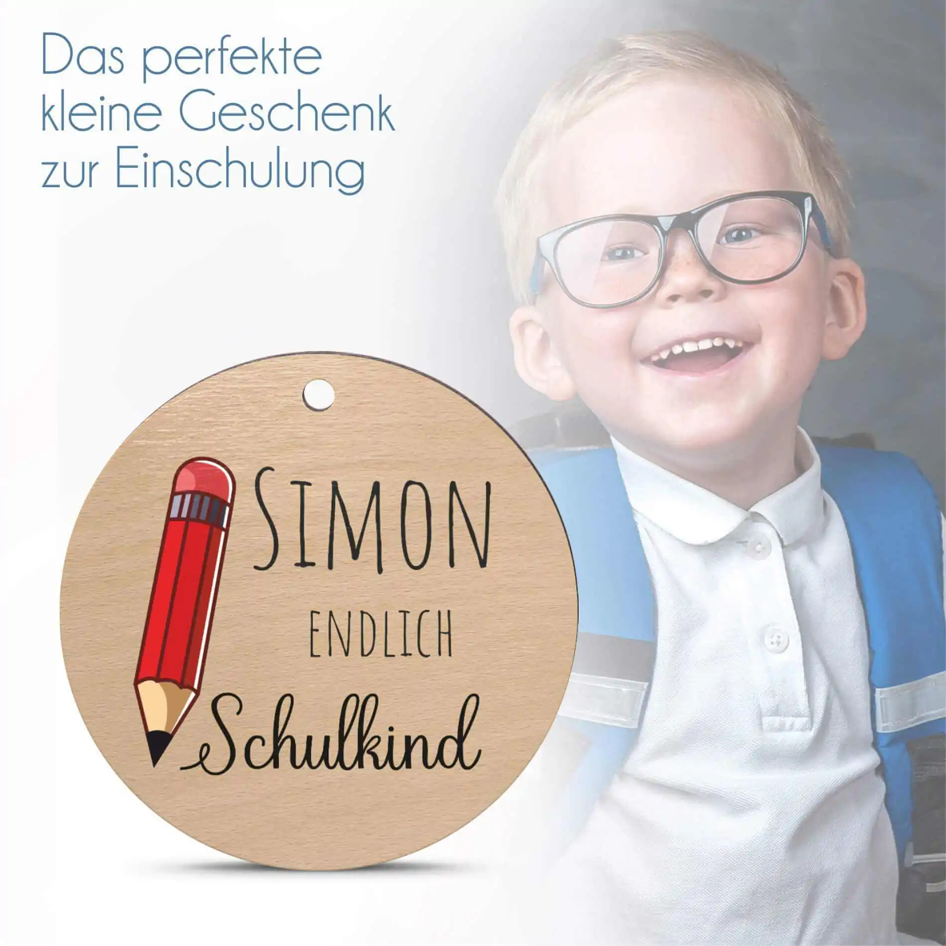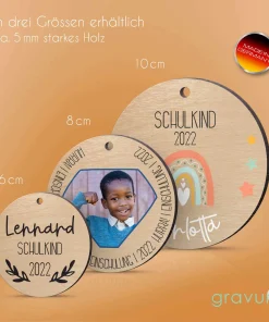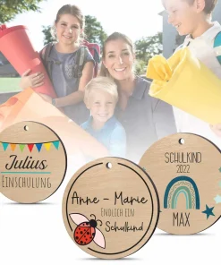 Verziere die Schultüte, den Schul Ranzen oder Rucksack Deines zukünftigen Schulkindes mit einem personalisierten Namensanhänger aus Holz. Der Holzanhänger kann entweder mit Namen, ein paar lieben Worten oder Glückwünschen versehen werden. So fungiert er gleichzeitig auch als kleiner Glücksbringer oder Mutmacher.
