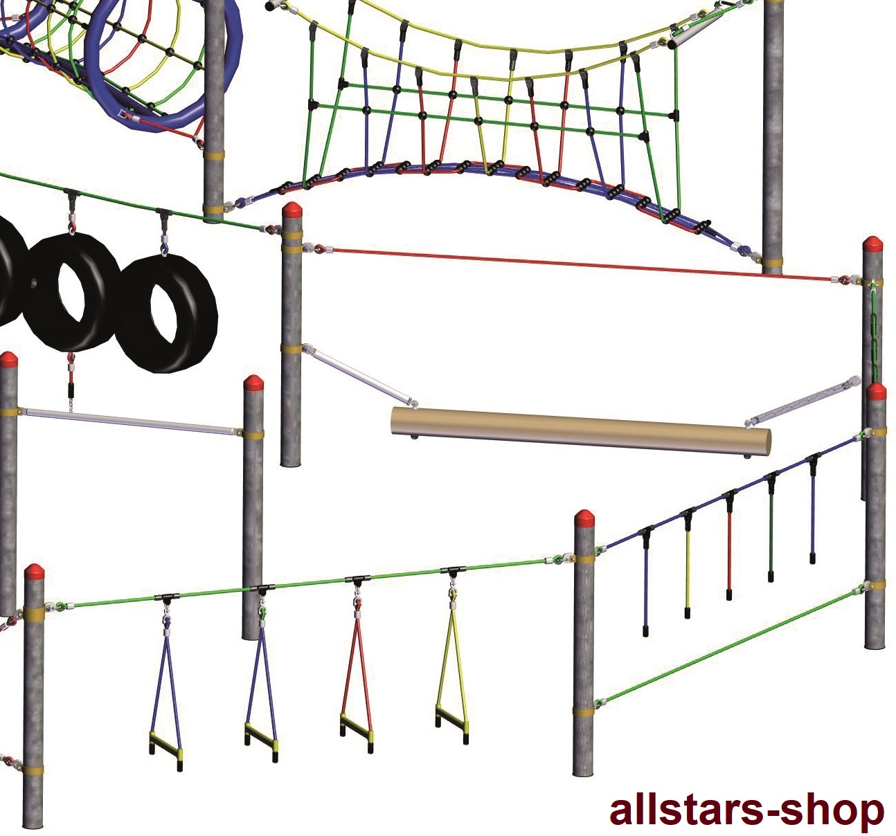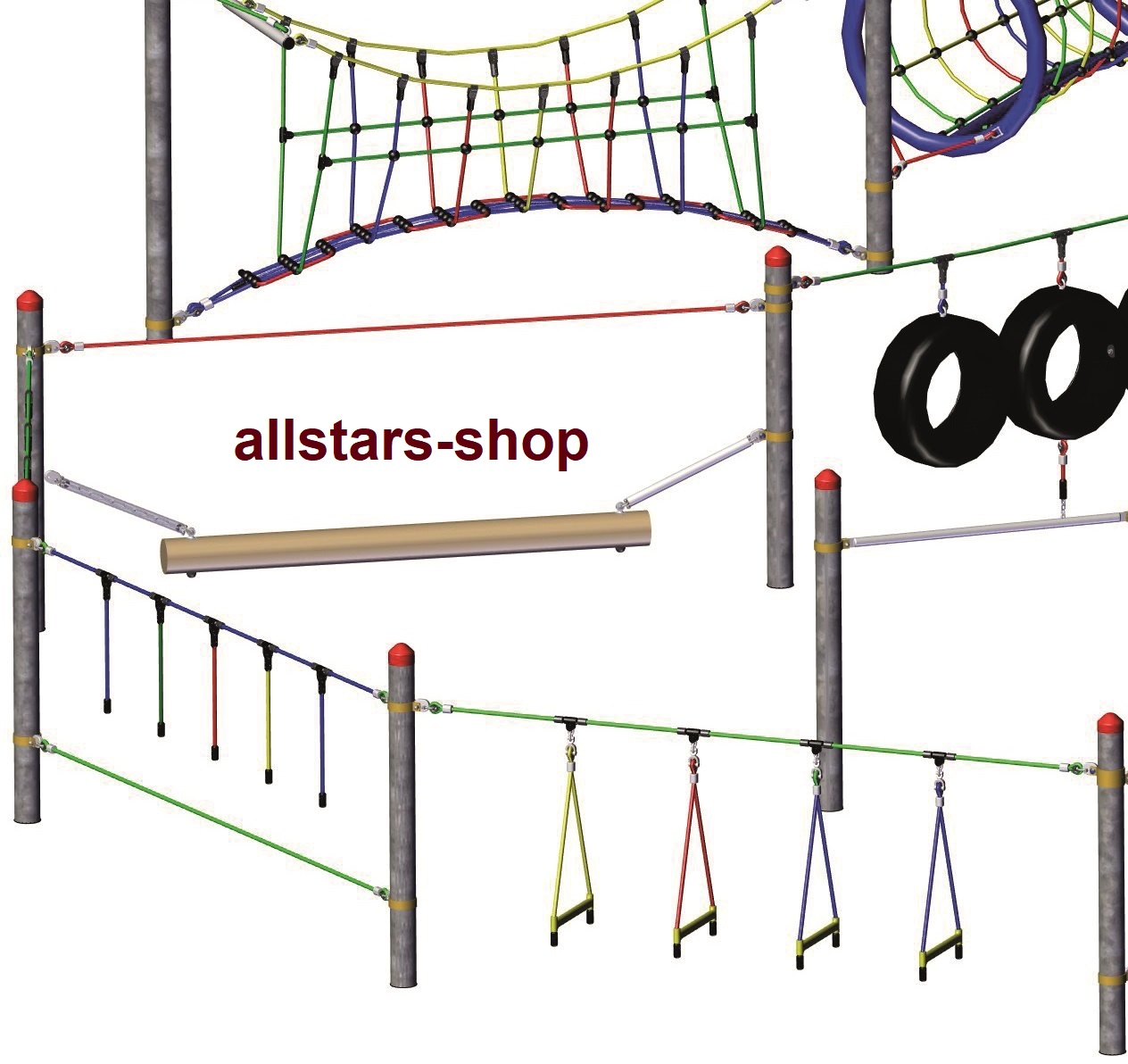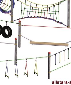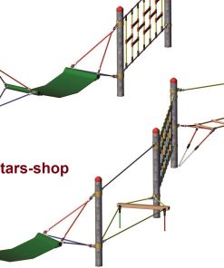 In öffentlichen Einrichtungen und Kindergärten im Härtetest auf “Herz und Nieren” geprüft. Abweichungen von obigen Bildern vorbehalten. Dieser Seilparcours gehört zu den stabilsten Kletteranlagen, die es zur Zeit am Markt gibt. Die Pfosten bestehen aus feuerverzinktem Stahlrohr und werden einbetoniert.