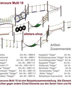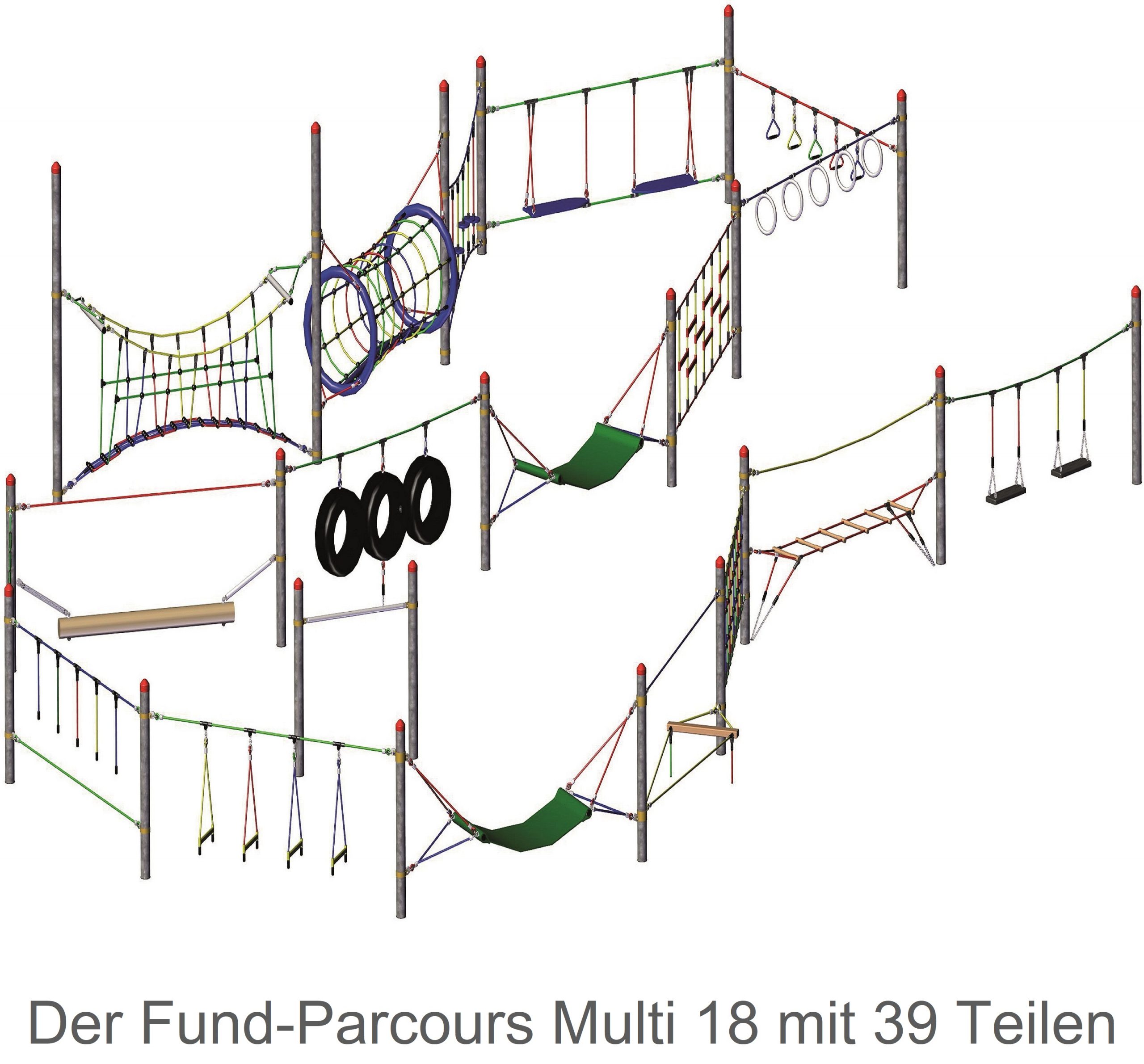 - Fun-Parcours Multi 18 – riesige multifunktionale Kletteranlage mit 18 Kletterelementen, für Kindergärten, Schulen, öffentliche Anlagen geeignet.