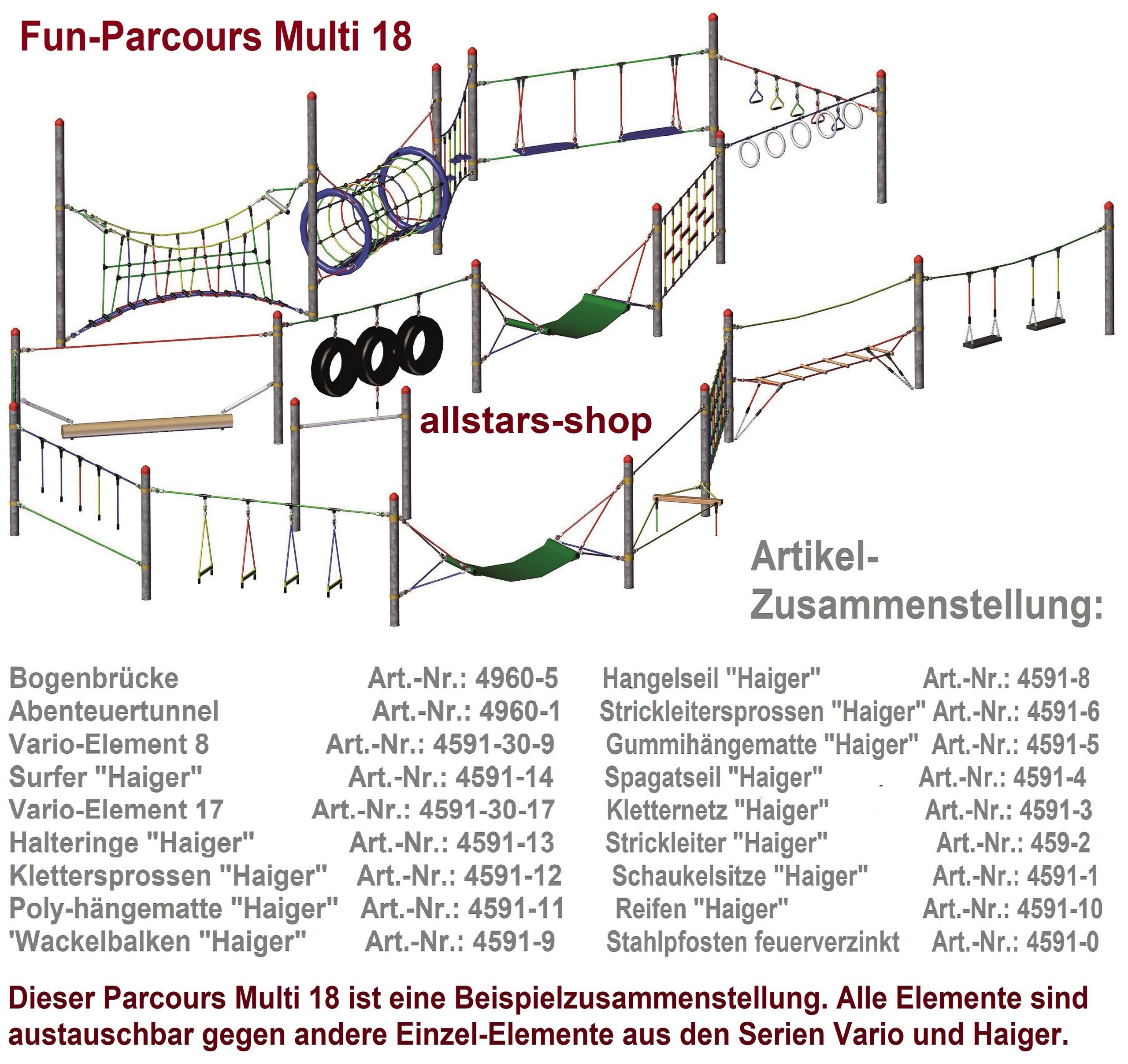 Stellen Sie sich selbst eine fantastische Multifunktions-Kletteranlage aus allen Möglichkeiten der Vario- und Haigerelementen von 1 bis 43 plus Kombinationen aus den Einzelangeboten zusammen. Für Gewerbetreibende stellen wir gerne kostenfrei unsere Kataloge zur Verfügung. Wir machen Ihnen gerne ein Angebot nach Ihren Zusammenstellungen.