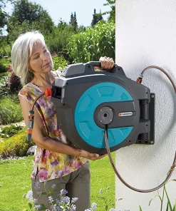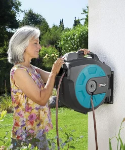 Die GARDENA Comfort Wand-Schlauchbox 25 roll-up automatic macht Giessen besonders einfach und bequem. Das Kurbeln übernimmt die Schlauchbox für Sie. Der Schlauch kann bequem und mit geringem Krafteinsatz ausgezogen und in kurzen Abständen von maximal 50 cm arretiert werden.