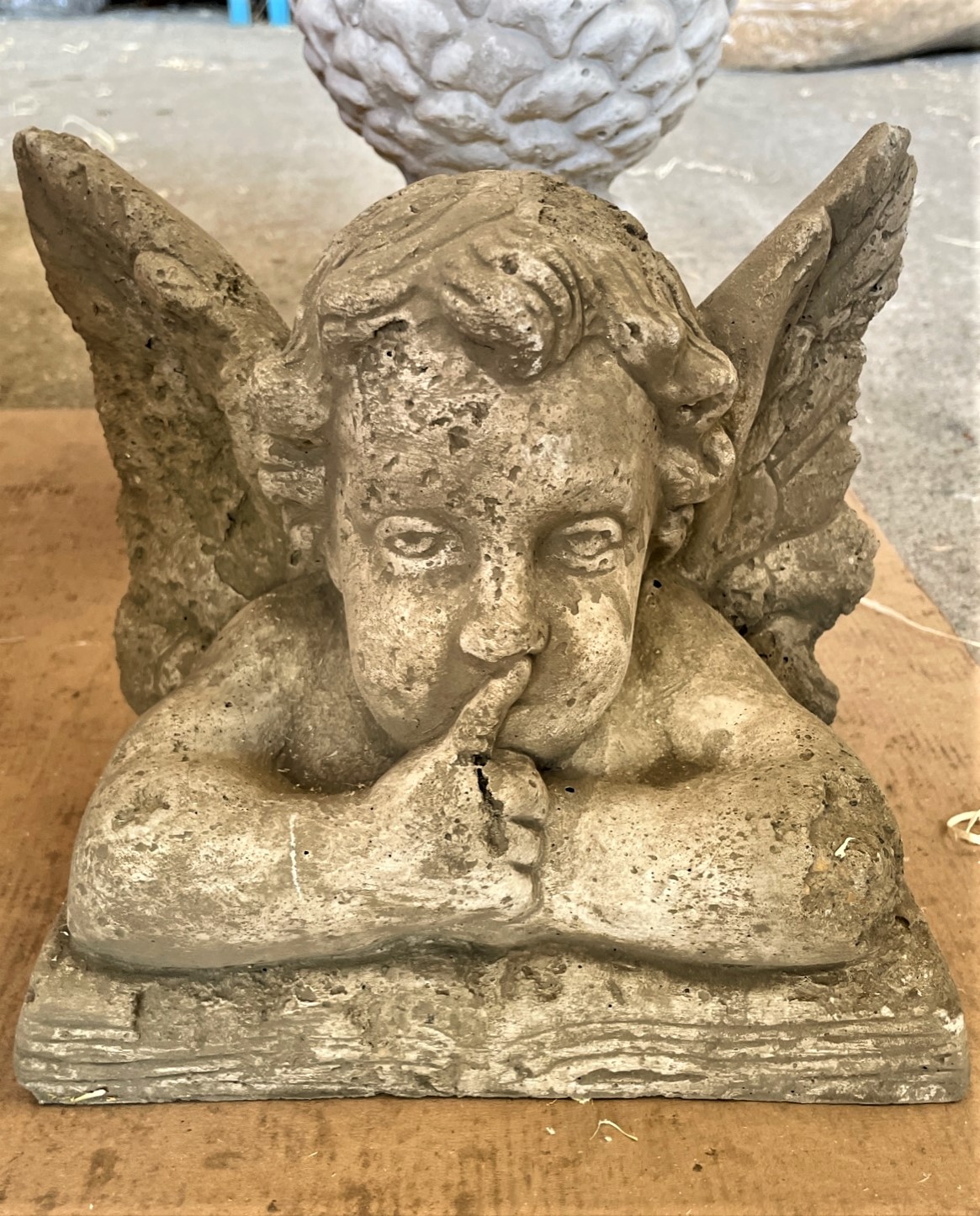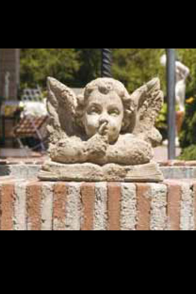 Diese Engelsfigur hält einen Finger vor ihre Lippen, als wollte sie uns signalisieren zu schweigen und zu hören, was die Umgebung für Geräusche zu bieten hat. Dabei ist sie auf ein großes Buch aufgestützt.