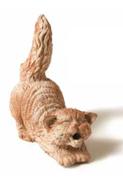 Diese Figur zeigt eine kleine Katze, die sich genüsslich streckt und dabei gähnt. Sie ist naturnah gestaltet. Das Material besteht aus Terracotta.