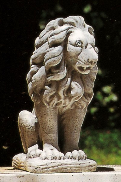 Dieser Löwe sitzt auf einem Stein und hat das Maul leicht geöffnet. Er schaut wachsam vor sich her und hat eine angespannte Haltung sowie eine wallende Mähne.