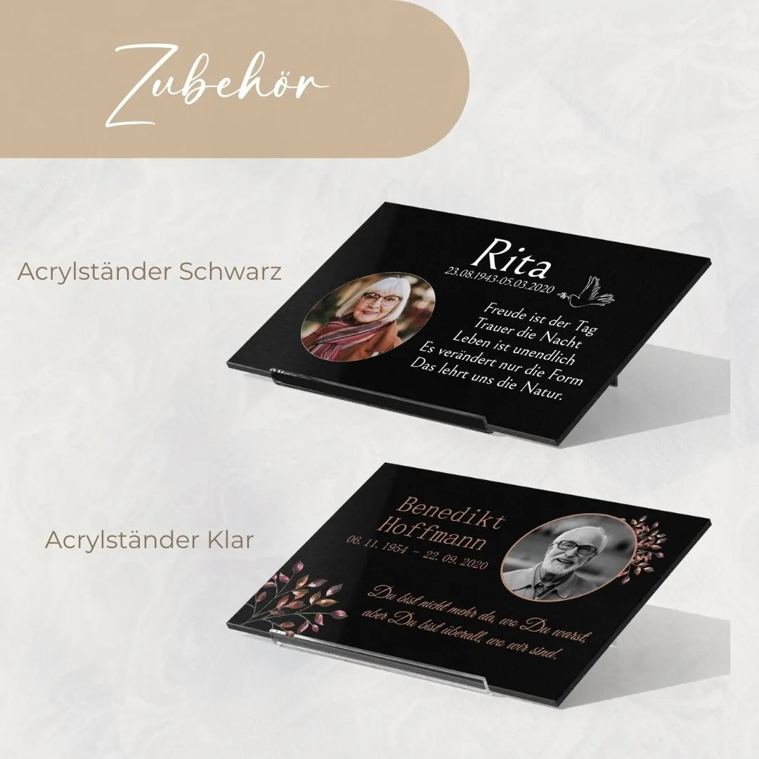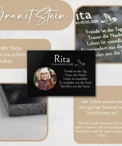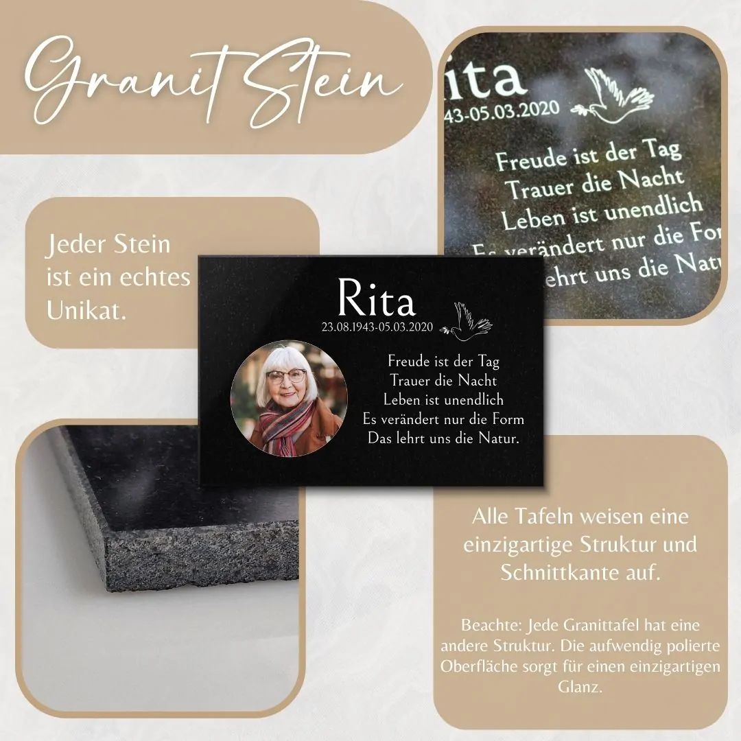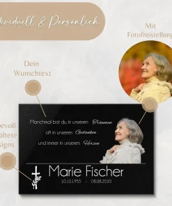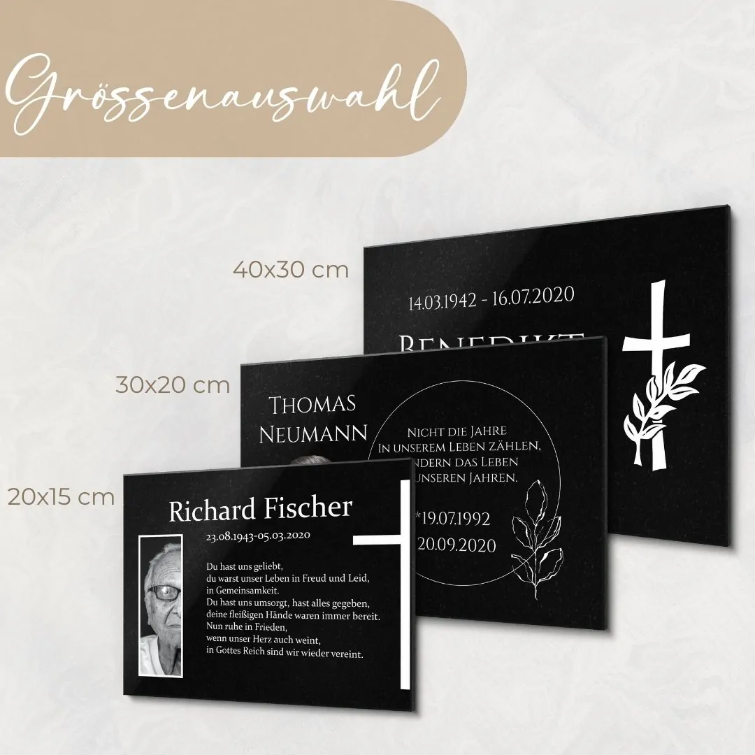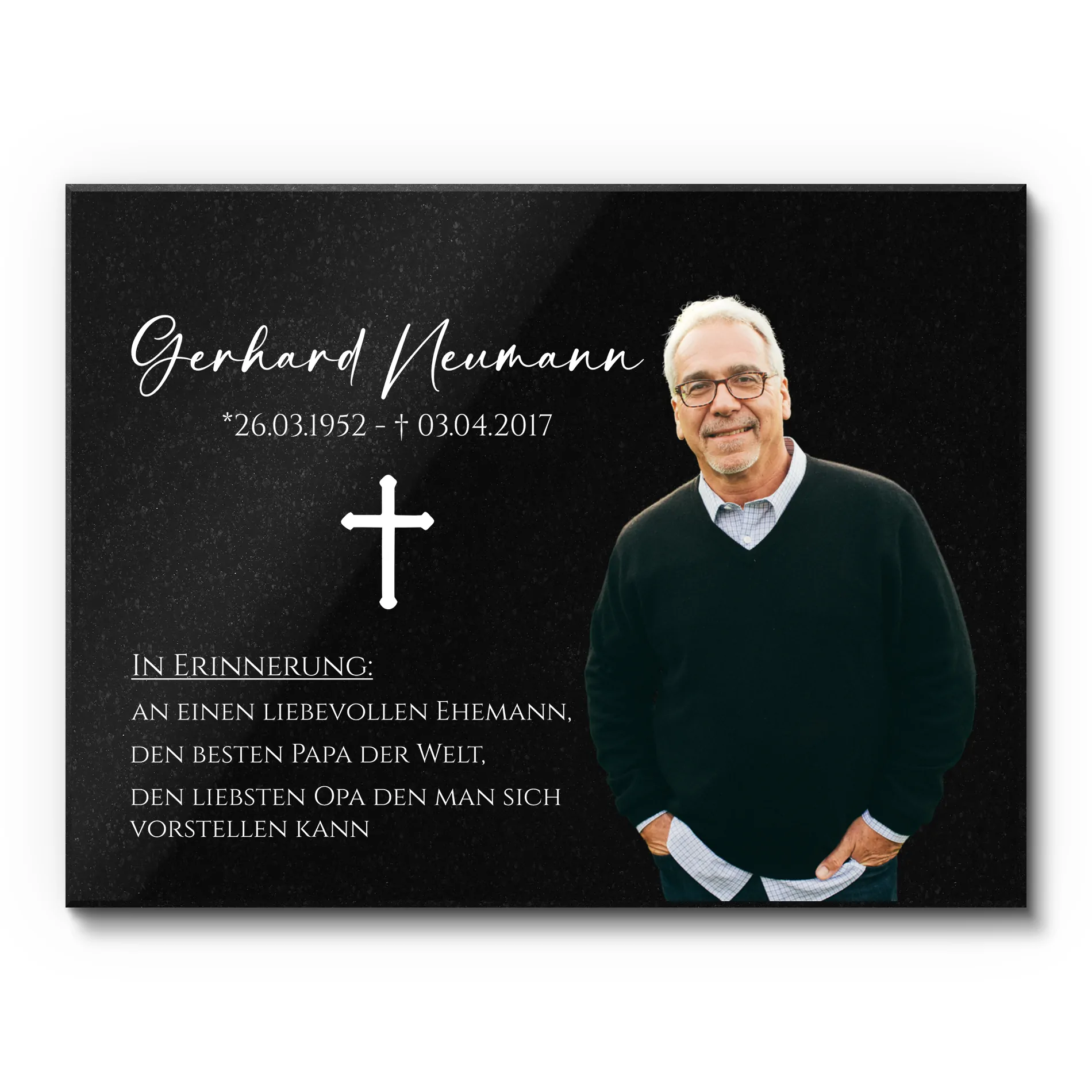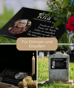 Bewahre die Erinnerung an einen geliebten Menschen mit unserer hochwertigen Granit-Gedenktafel, die durch farbigen UV-Druck zum Leben erweckt wird. Die aufwendig polierte Oberfläche des Granits spiegelt die Tiefe und die Bedeutung des Andenkens wider, während der lebendige Farbdruck die Persönlichkeit des Verstorbenen einfängt und ehrt.