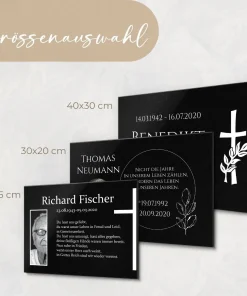 Im Konfigurator kannst Du die Gedenktafel ganz individuell selbst gestalten. Hierzu kannst Du deinen eigenen Wunschtext, z.B. auch einen Trauerspruch oder eine persönliche Botschaft eingeben, eine passende Schriftart sowie Schriftfarbe auswählen und ein Foto einfügen. Des Weiteren steht Dir eine große Auswahl an liebevoll gestalteten Motiven zur Verfügung.