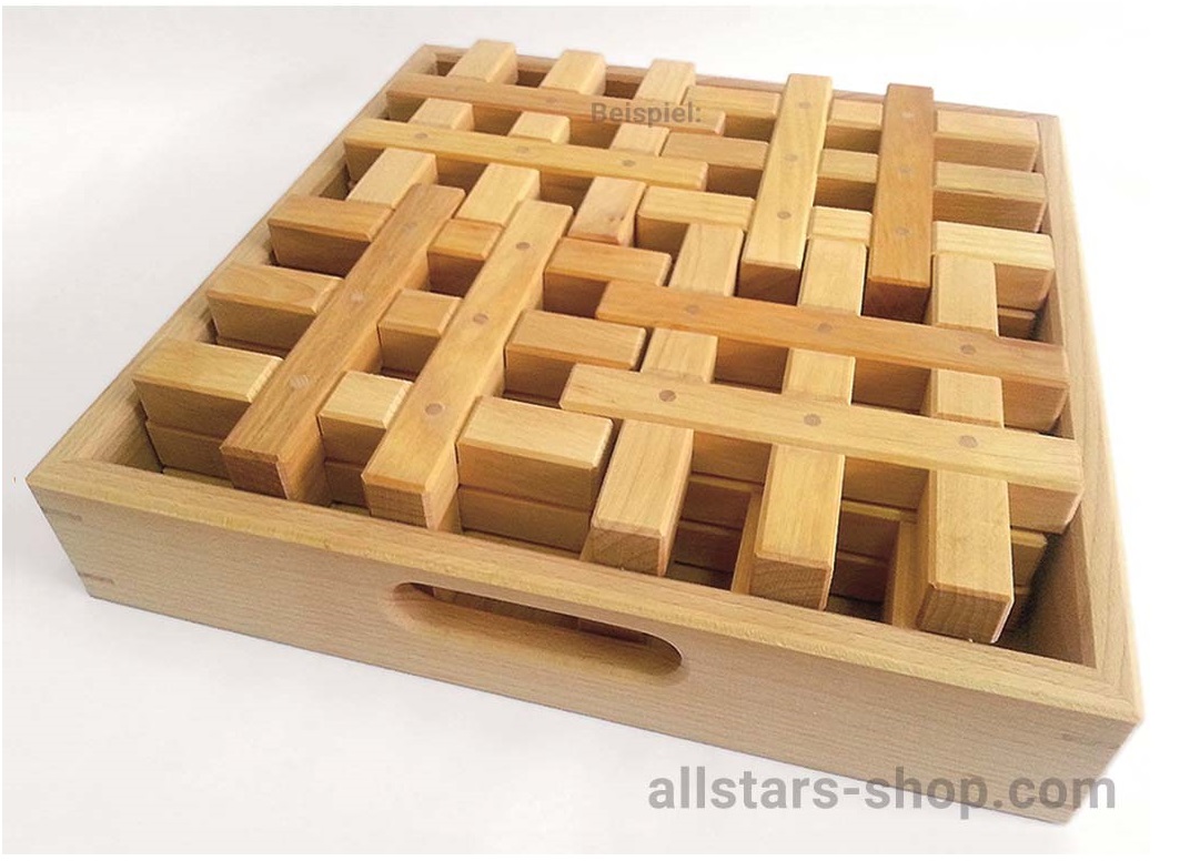 - Stabiler Holzkasten mit Trageöffnungen zum Lagern der Gitterklötze (38 x 38 x 9 cm)