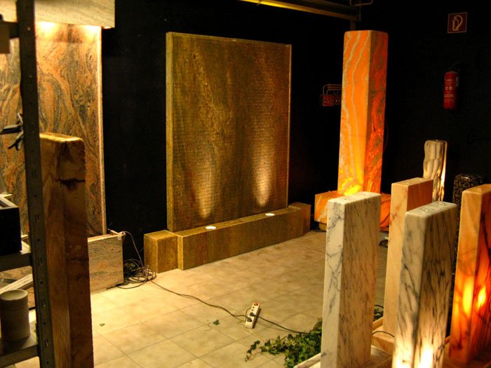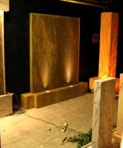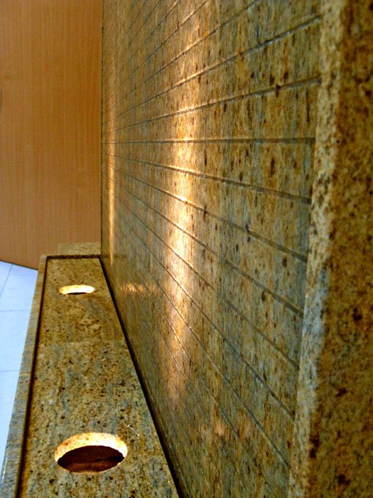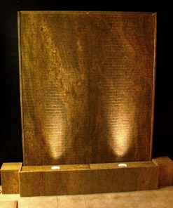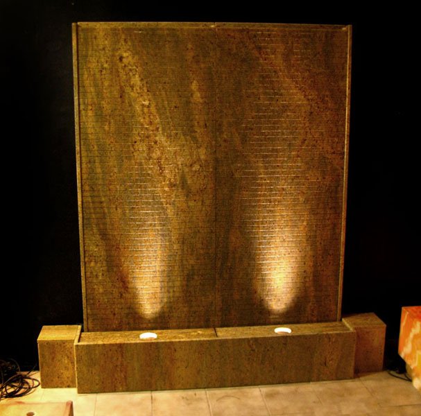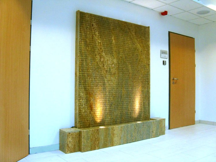Es handelt sich beim Brunnen “Sahara” um eine gerillte Wasserwand aus Kashmir Gold Granit. Mit dieser individuellen Lösung erhalten Sie einen effektiven Luftbefeuchter und ein optisch beeidruckendes Wasserspiel für Ihr Heim. Über die gerillte Oberfläche läuft das Wasser lebhaft über die Granit-Tafeln nach unten und sorgt für eine beruhigende harmonsche Atmosphäre. In den seitlichen Elementen (Granit-Würfeln) können die Elektro-Anschlüsse untergebracht werden. Die gesamte Anlage ist ca. 2 Meter breit. Zwei kräftige LED-Scheinwerfer (á 6W) werden im Wannenbereich platziert und beleuchten die Wasserlauffläche durch Bohrungen in den beiden Abdeckplatten. Durch die gerillte Oberfläche ergibt sich ein sehr lebhaftes und bewegtes Wasserbild.