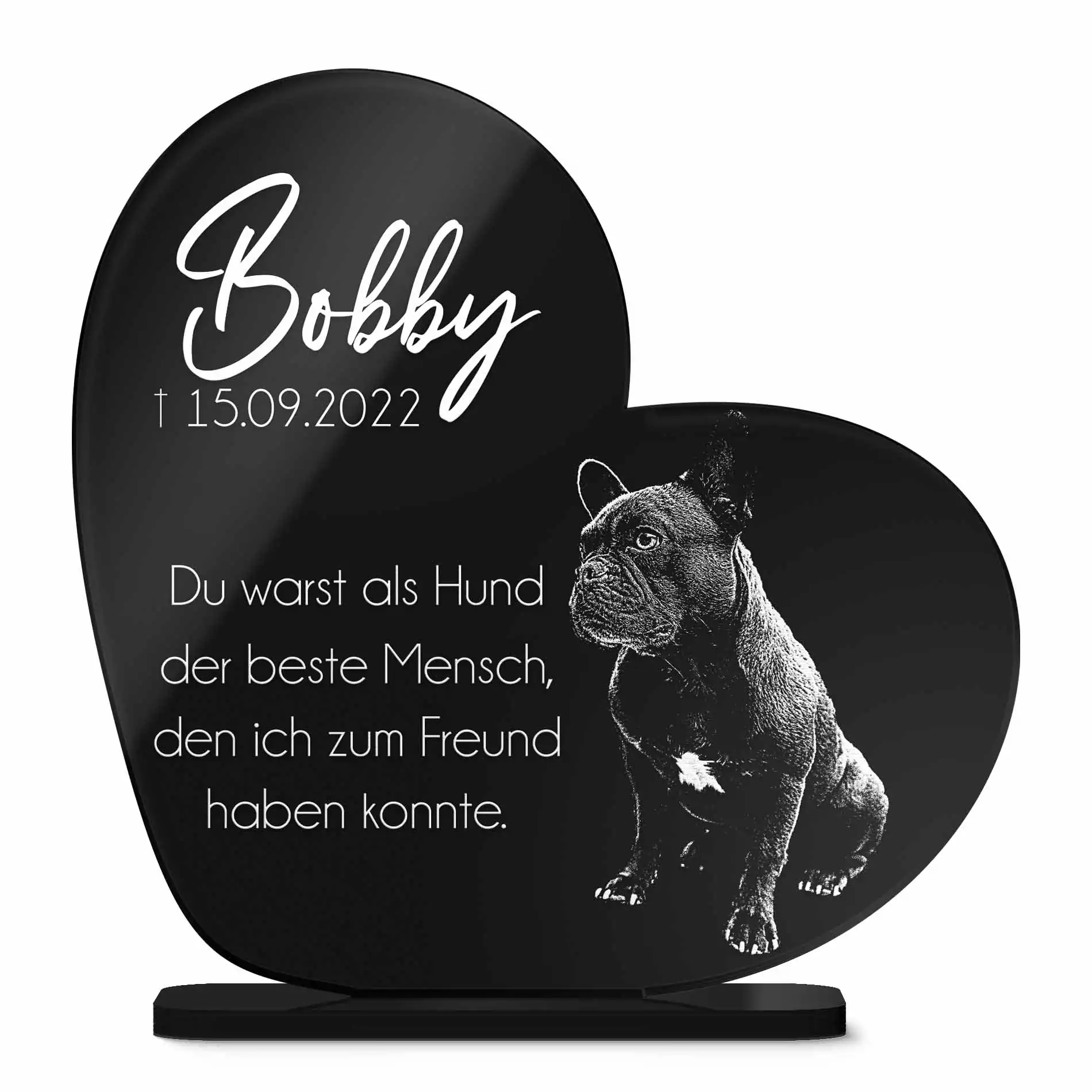 Was bleibt, wenn alles Vergängliche geht, ist die Liebe. Bringe diese ewig währende Liebe zu einem ganz besonderen Menschen oder Vierbeiner auf unseren bildschönen Standherzen aus Hochglanz Acrylglas zum Ausdruck. Mit diesem stilvollen Erinnerungsstück fürs Wohnzimmer oder auch als Grabschmuck wirst Du Dich immer gerne an unvergessliche Momente und kostbare Augenblicke zurückerinnern. Verleihe dieser einzigartigen Gedenktafel mit einer individuellen Fotogravur eine unvergleichliche persönliche Note und erstelle Dir selbst ein Andenken, welches Deinen Lieblings-Vierbeiner für alle Ewigkeiten in Ehren und in Deinem Herzen hält.
