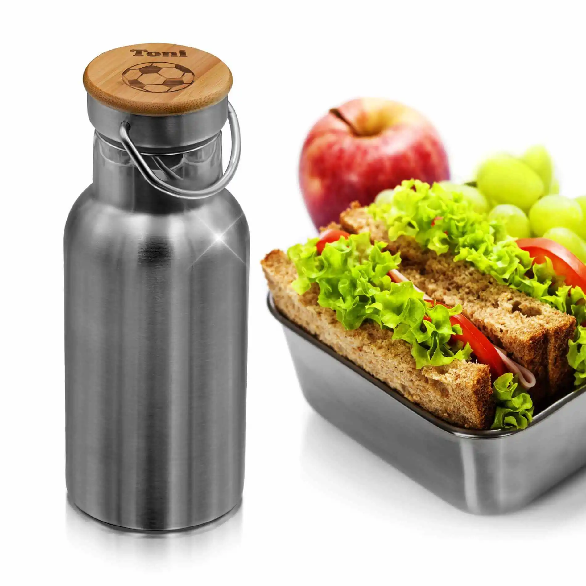 Unsere niedlichen Kindertrinkflaschen eignen sich ideal als Aufbewahrung für das Getränk von Deinem Schulkind oder Kindergartenkind. Aus einer individualisierbaren Getränkeflasche mit dem eigenen Namen und einem Dinosaurier, Feuerwehr Auto, Regenbogen Fußball, Pferd oder Einhorn schmeckt der Inhalt doch gleich viel besser! Die Edelstahl-Trinkflasche mit Schraubverschluss ist nicht nur optisch ein Hingucker in der Schule, Kita oder im Kindergarten – sie ist auch noch nachhaltig plastikfrei aus Metall und Bambus