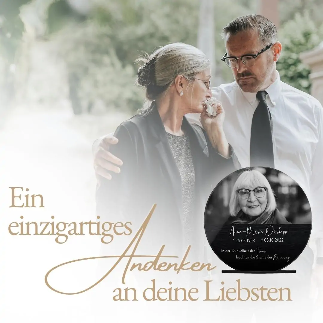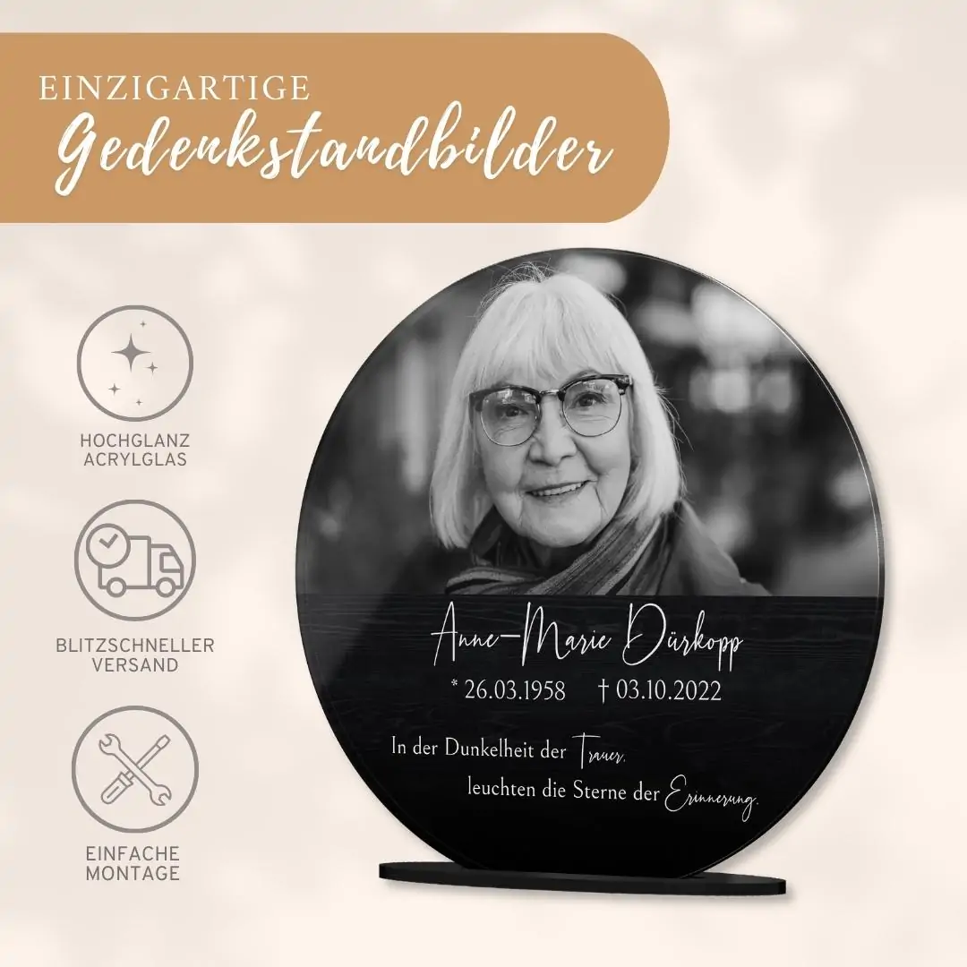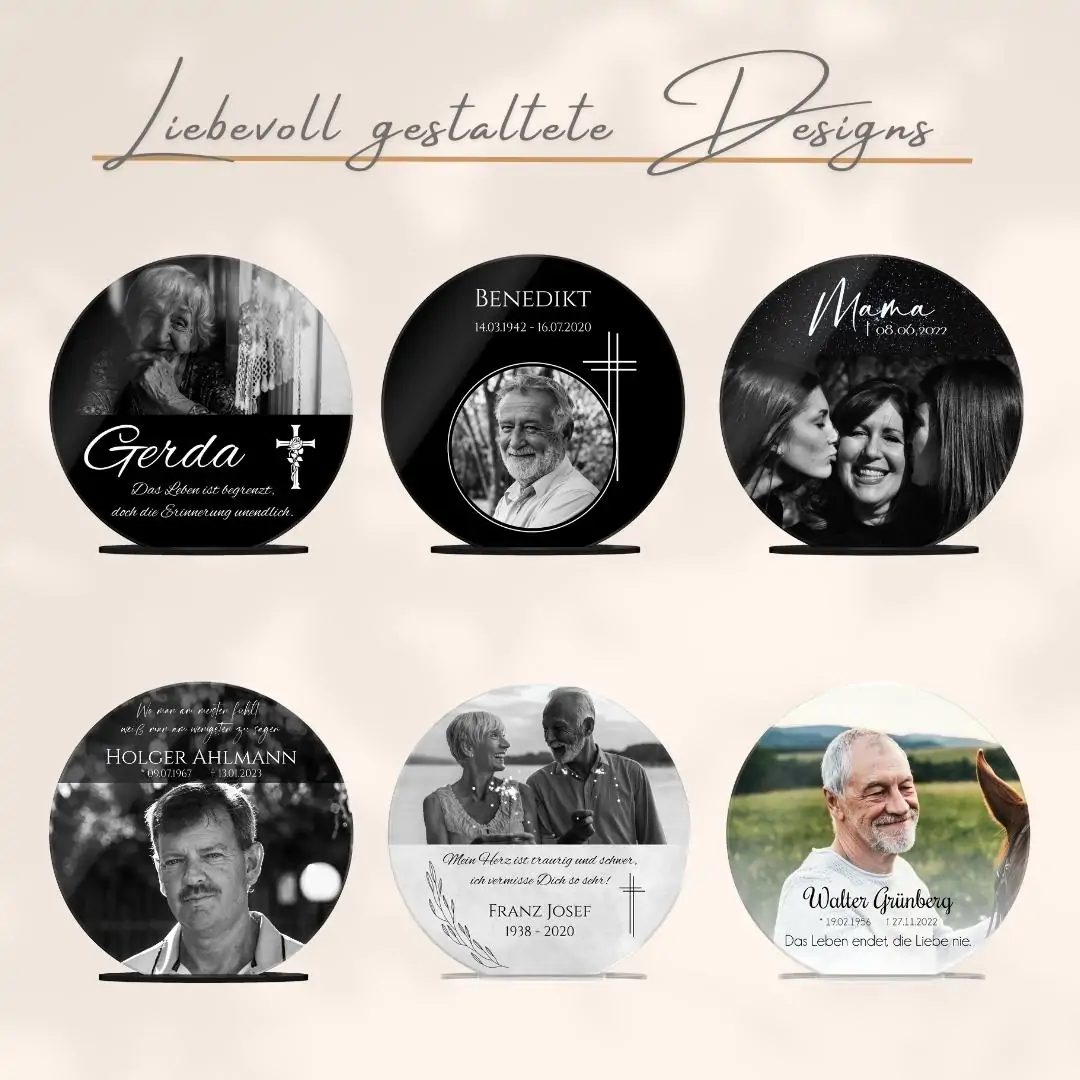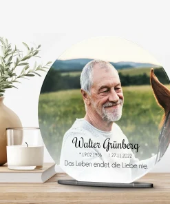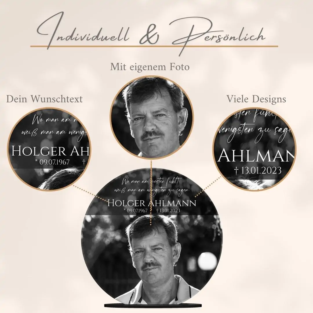 Verewige die Erinnerungen an ein geliebtes Familienmitglied auf einem persönlich gestalteten Acryl Glasfoto, um auch nach dem Tod noch die gemeinsame Zeit am Leben zu erhalten. Verziert mit einer liebevollen Botschaft oder Widmung und Deinem Lieblingsbild der verstorbenen Person wird der Bildaufsteller zu einem lebendigen Andenken und einem einzigartigen Erinnerungsstück. Auch als personalisiertes Trauergeschenk oder als Geschenk zur Beerdigung für die Angehörigen wird es gerne verschenkt.