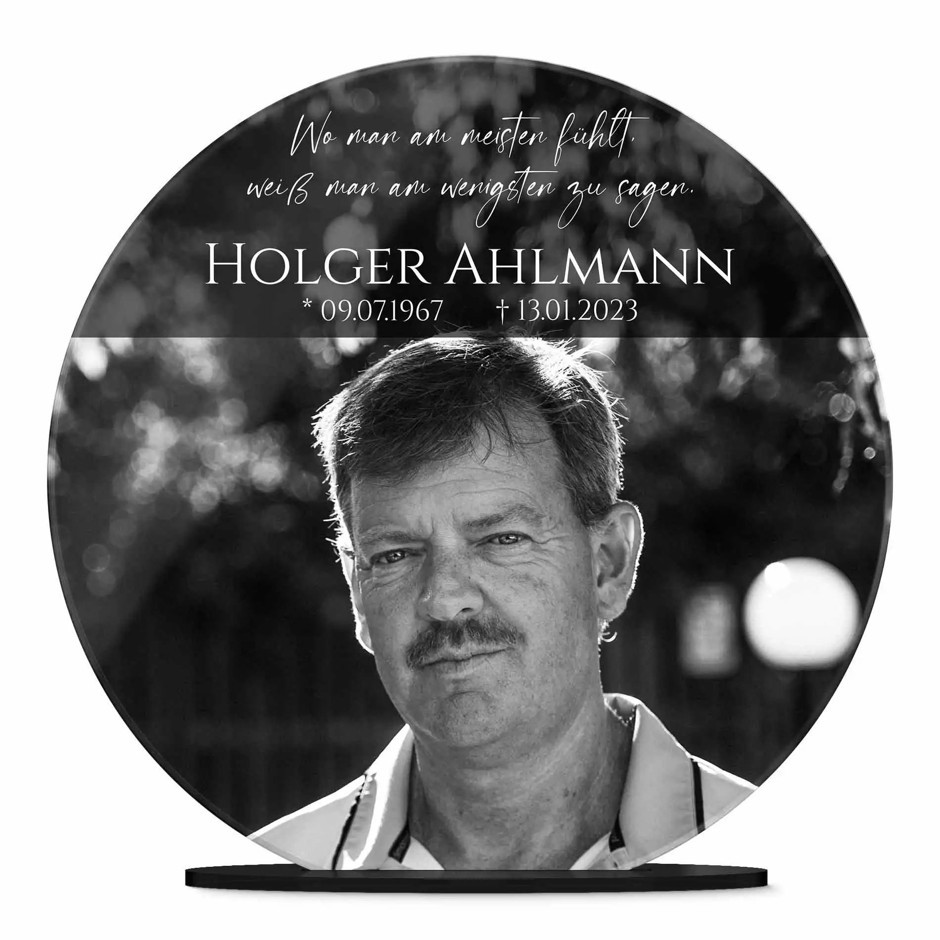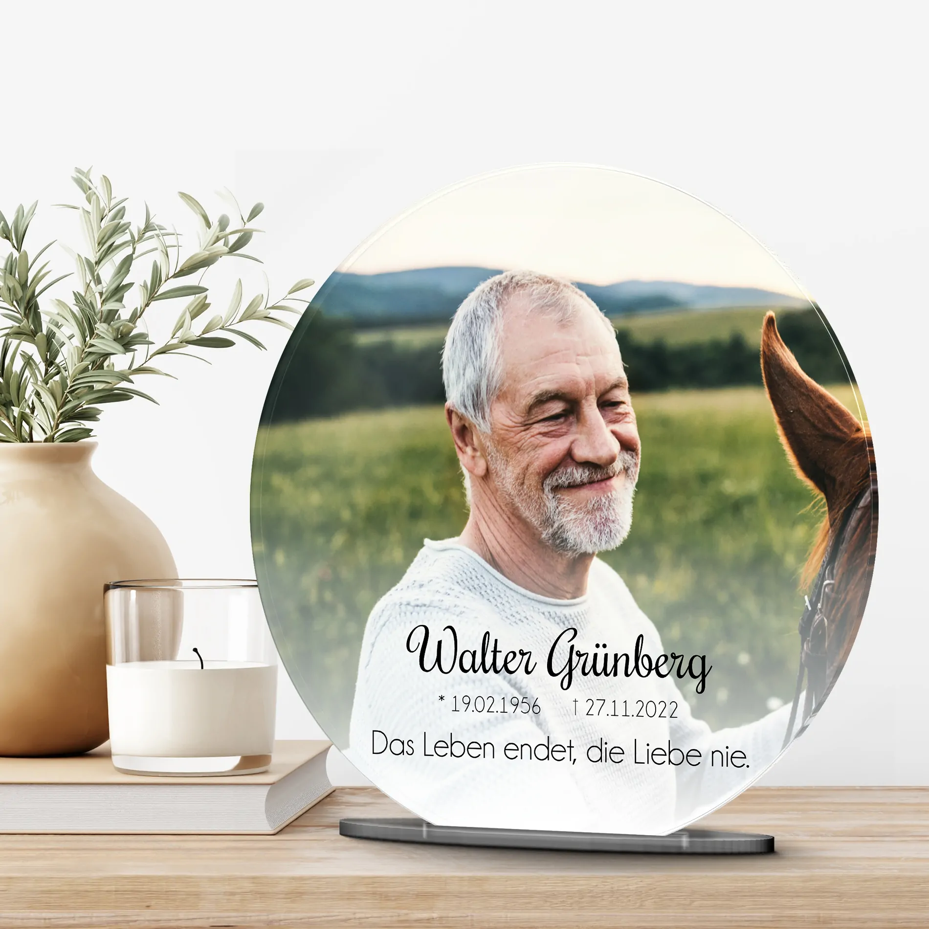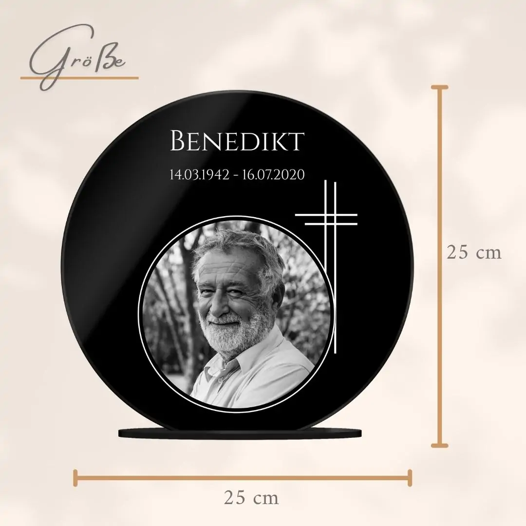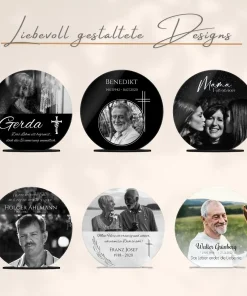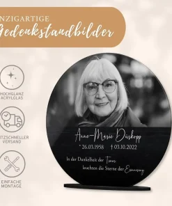 Verewige die Erinnerungen an ein geliebtes Familienmitglied auf einem persönlich gestalteten Acryl Glasfoto, um auch nach dem Tod noch die gemeinsame Zeit am Leben zu erhalten. Verziert mit einer liebevollen Botschaft oder Widmung und Deinem Lieblingsbild der verstorbenen Person wird der Bildaufsteller zu einem lebendigen Andenken und einem einzigartigen Erinnerungsstück. Auch als personalisiertes Trauergeschenk oder als Geschenk zur Beerdigung für die Angehörigen wird es gerne verschenkt.