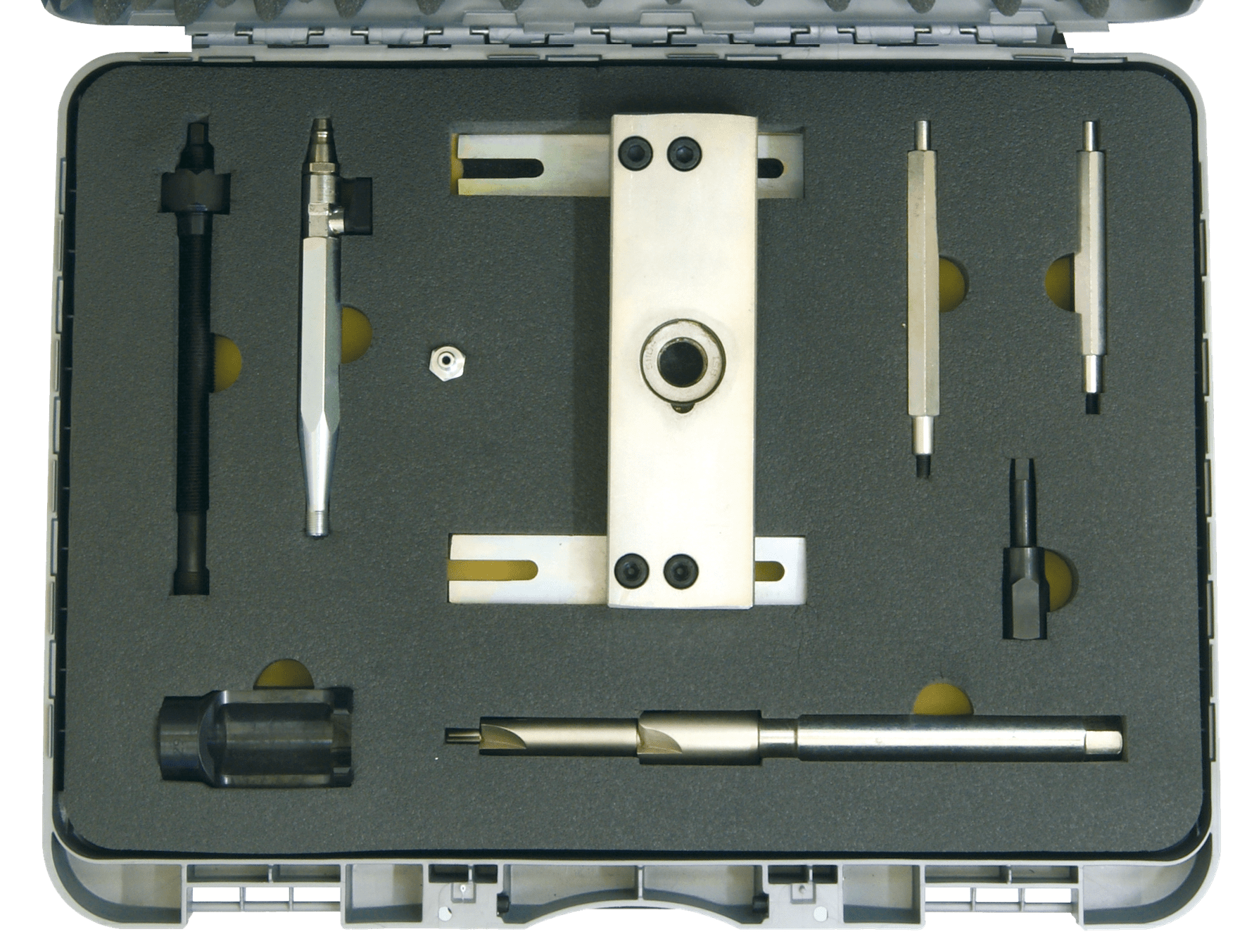 Die spezielle Zylinderbrücke ist für diesen Motortyp konzipiert und enthält ein Wälzlager für das mechanische Ausziehen mittels Spindel. Der Satz enthält zusätzlich eine Reibahle für die Reinigung des Injektorsitzes. Der beiliegende Ausblasstift wird in die Glühkerzenöffnung geschraubt und verhindert, dass Schmutz in den Zylinder gelangen kann.