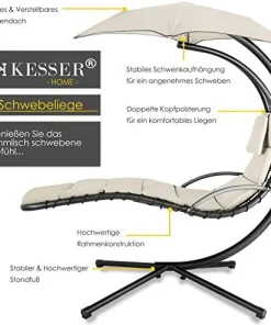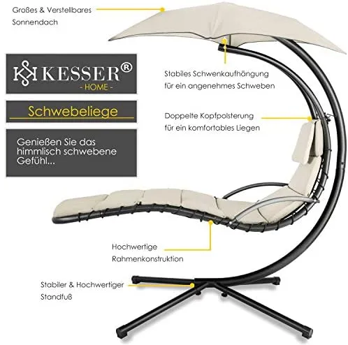 SCHWEBEN: Mit der KESSER Schwingliege der Entspannung entgegen schweben. An einem Bogengestell aus stabilem Stahlrohr mit Ø ca. 60/42 mm Stärke, hängt die 200 cm lange und 64 cm breite Liege in einer Karabineraufhängung nahezu schwerelos.