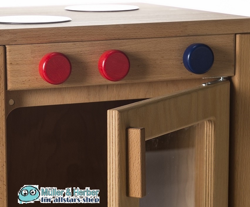 Die Kinderspielküche besteht aus geöltem Buchen-Massivholz.