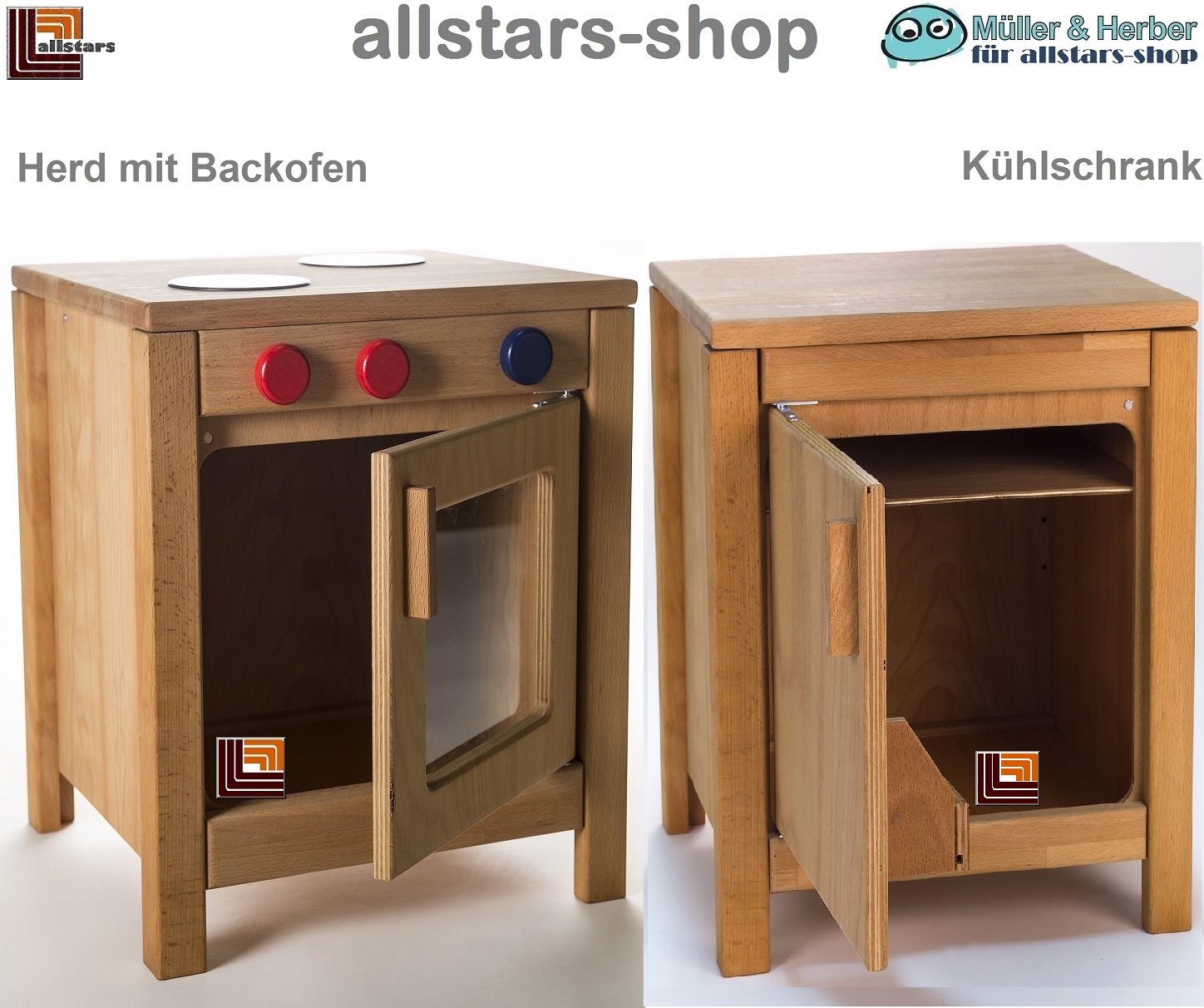 - Artikel: Kinder-Holzküchenmöbel – hier Herd mit Backofen und Kühlschrank – ohne Zubehör
