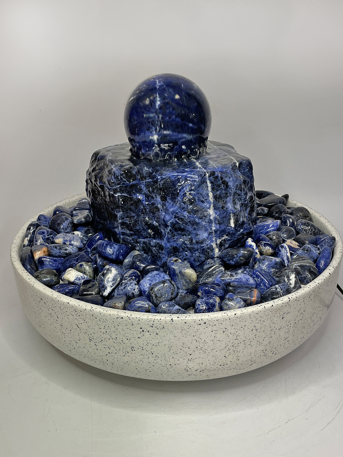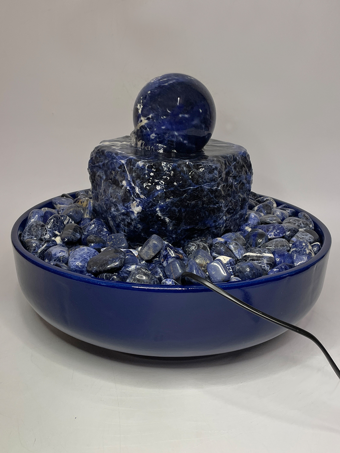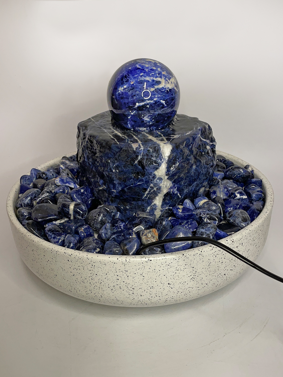 Der Quellstein als auch die 10cm große Kugel dieses Brunnenmodells sind aus edlem brasilianischen Sodalith gefertigt und ist ein großartiger Blickfang in Ihrem Zuhause. Die Kugel dreht sich sanft allein durch die Kraft des Wassers auf dem Wasserfilm des Basissteins.