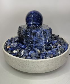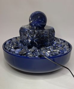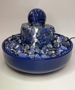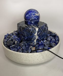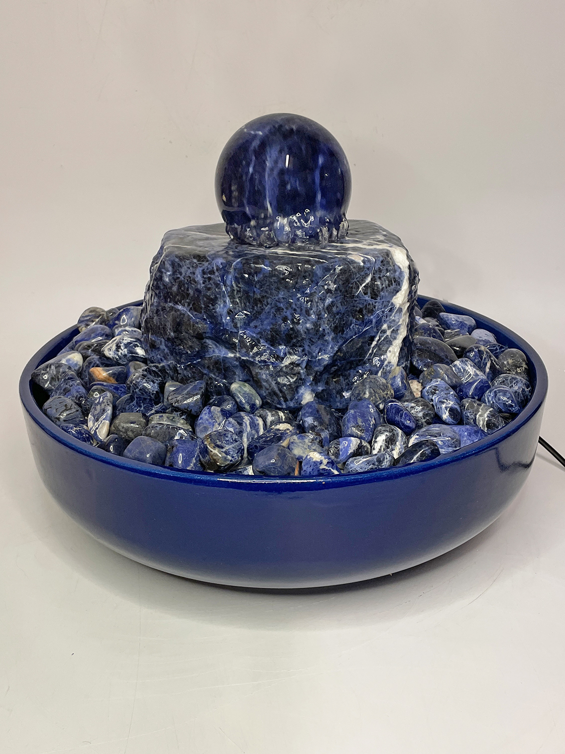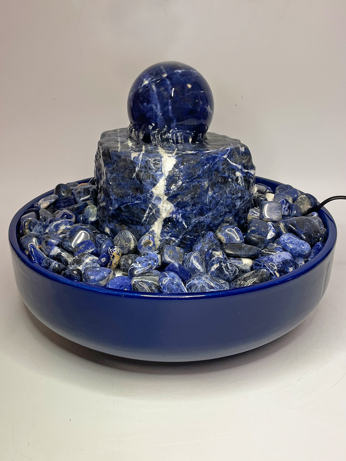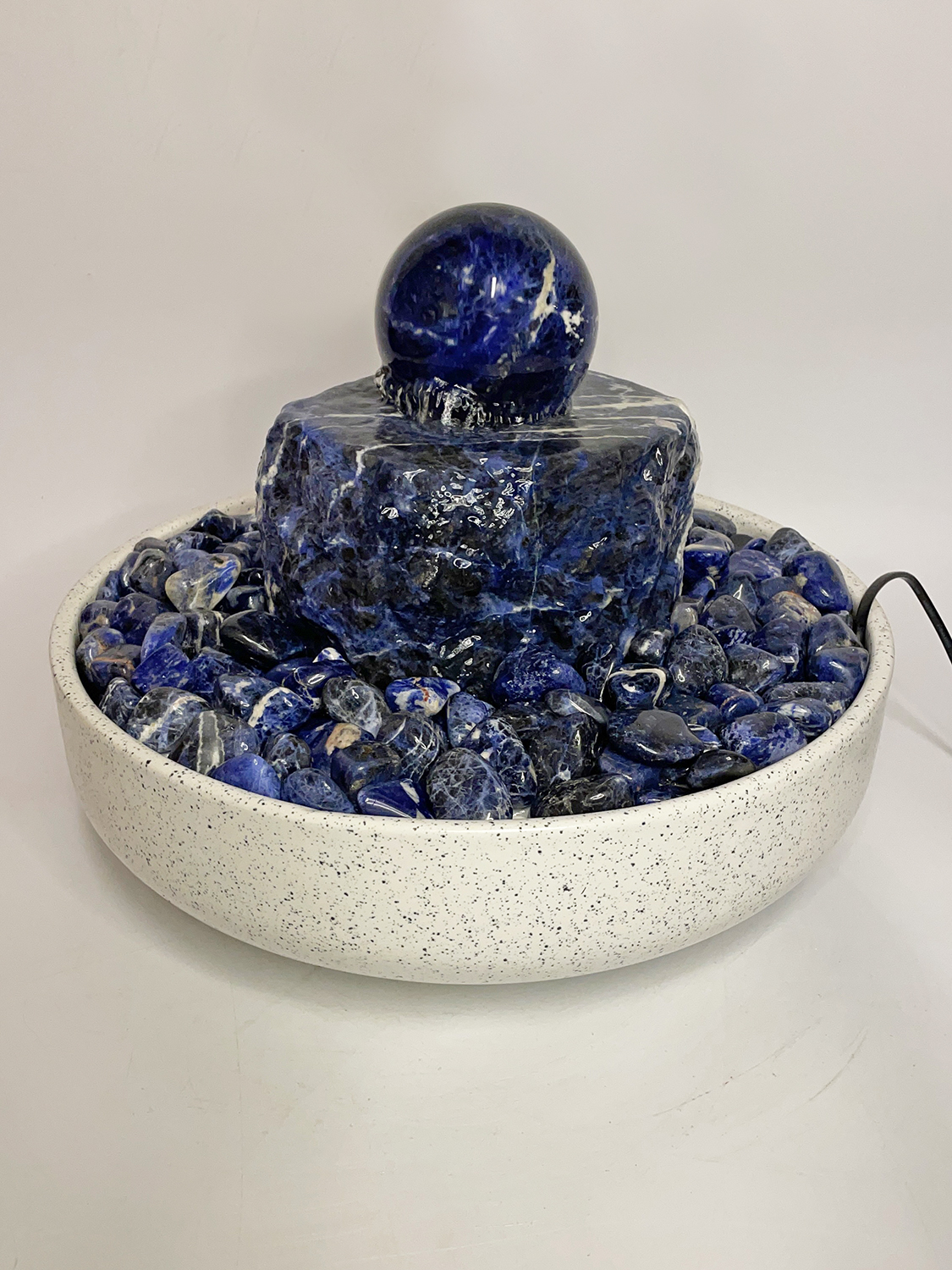 Der Quellstein als auch die 10cm große Kugel dieses Brunnenmodells sind aus edlem brasilianischen Sodalith gefertigt und ist ein großartiger Blickfang in Ihrem Zuhause. Die Kugel dreht sich sanft allein durch die Kraft des Wassers auf dem Wasserfilm des Basissteins.