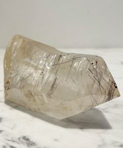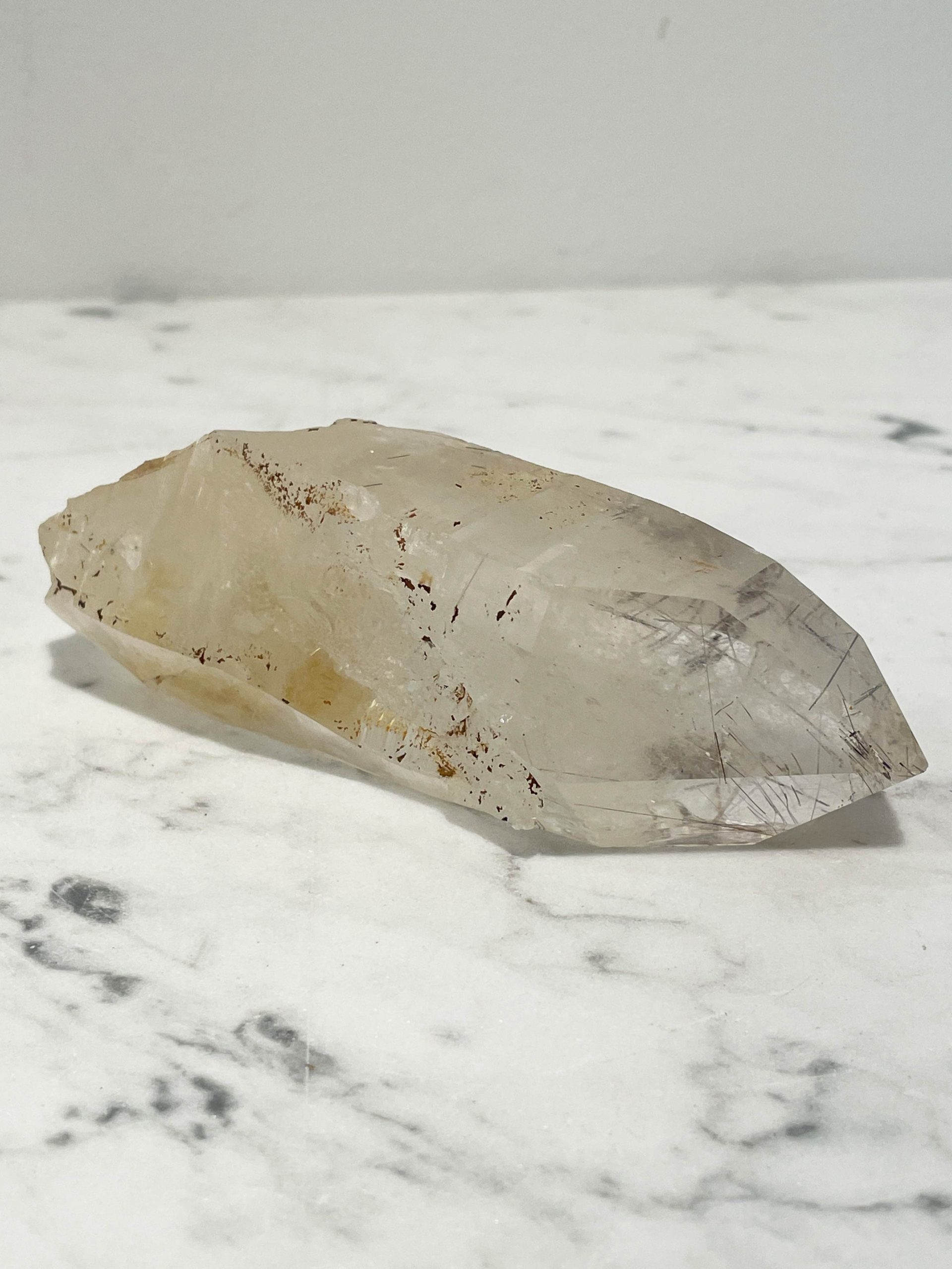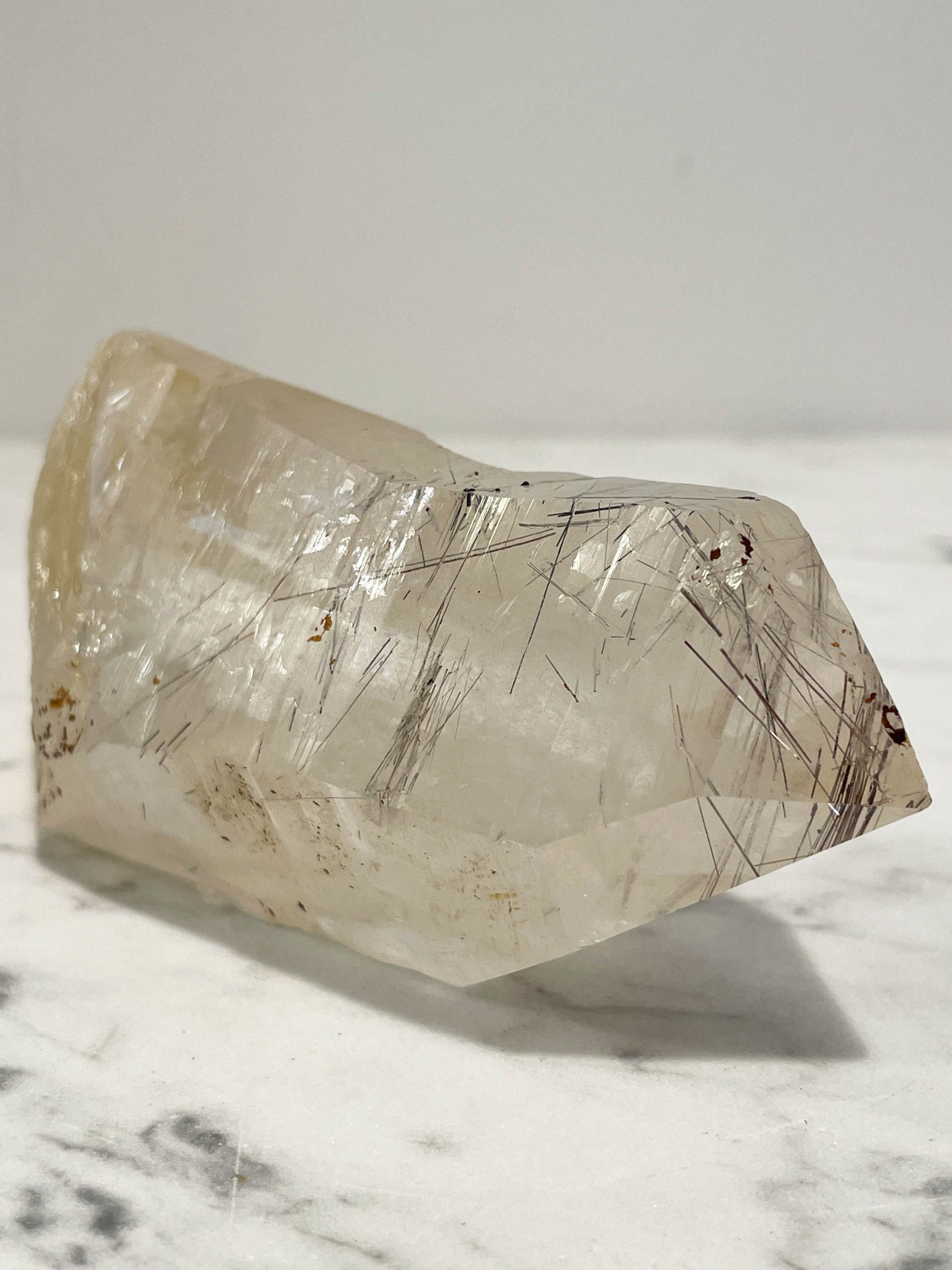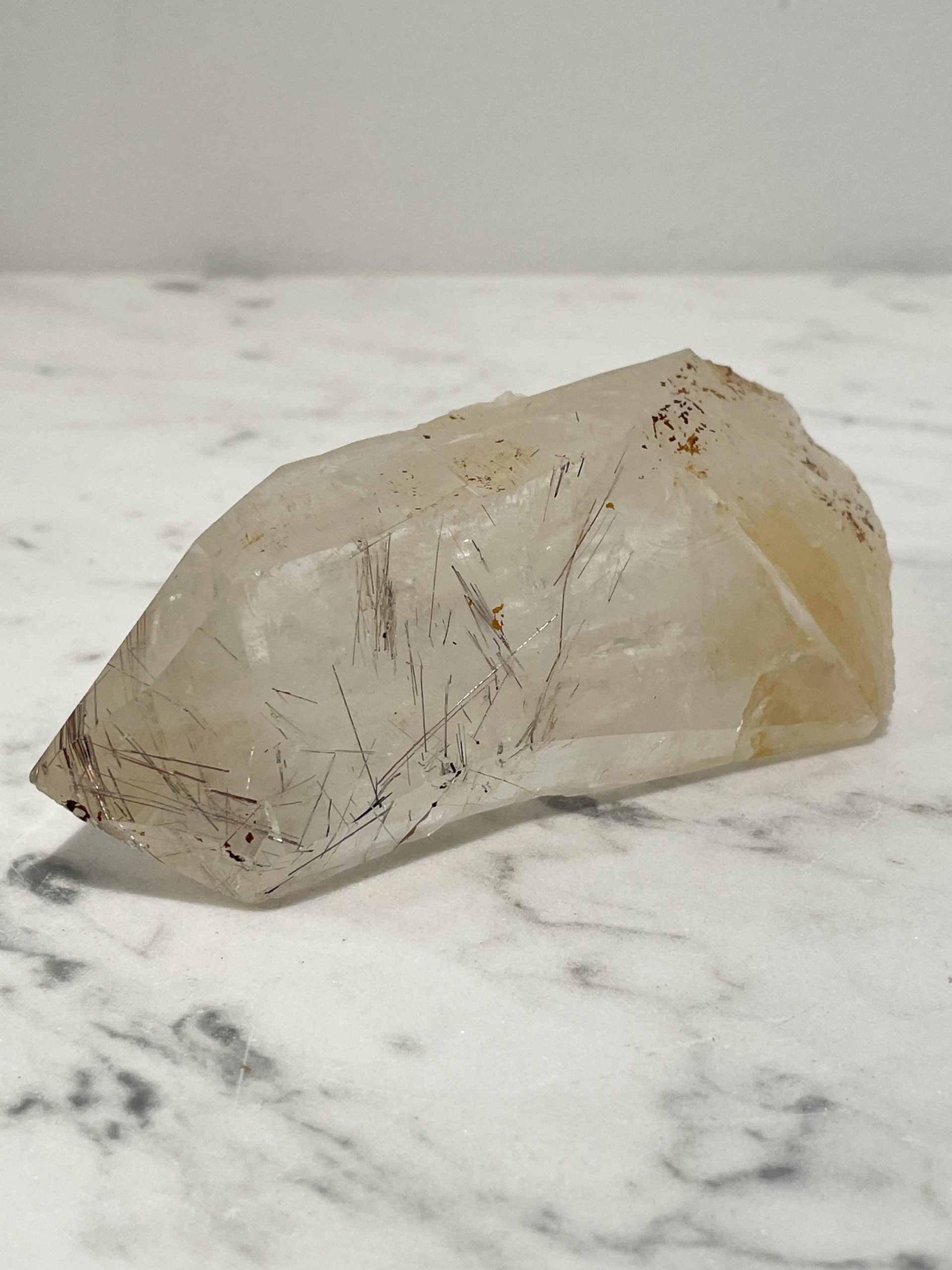 Dieser besondere Kristall ist von Rutilnadeln durchwachsen und kleinflächig von Limonit überzogen. Alle Flächen sind naturbelassen, weder geschliffen noch poliert.