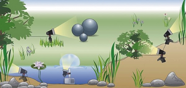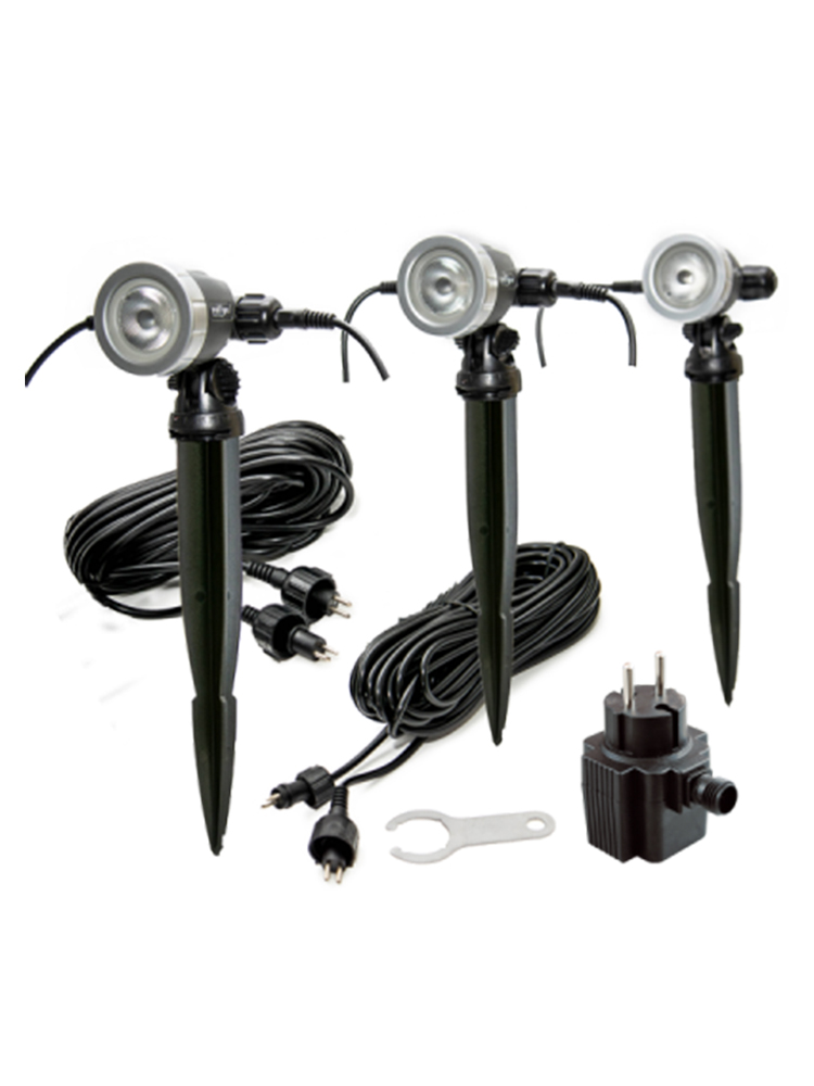 Mit den drei LED-Scheinwerfern “Aqualight” lässt sich die Umgebung in den Abendstunden individuell in Szene setzen. Sie sind vielseitig einsetzbar; zum Beispiel zum Ausleuchten von Wasserspielen oder Springbrunnen; als Teichbeleuchtung oder als Wegrandbeleuchtung. Auch die Beleuchtung von Objekten; Bäumen und Sträuchern ist problemlos möglich.