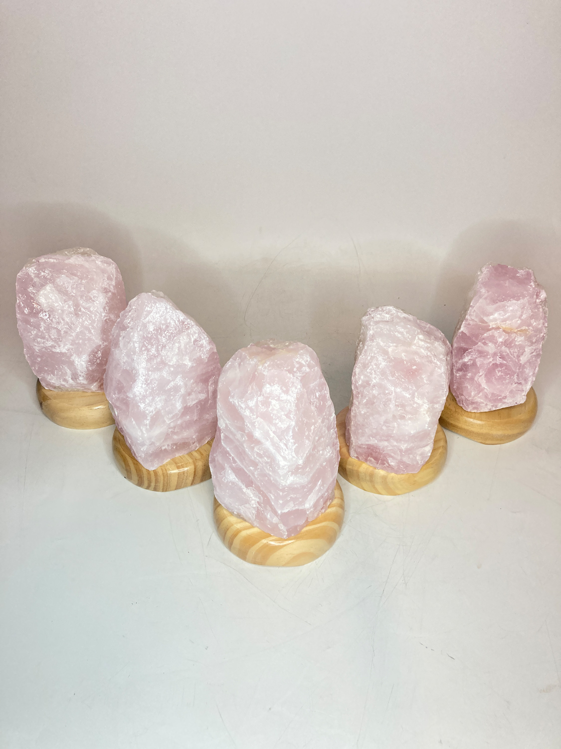 Der Rosenquarz ist fix auf einem Holzsockel montiert.