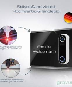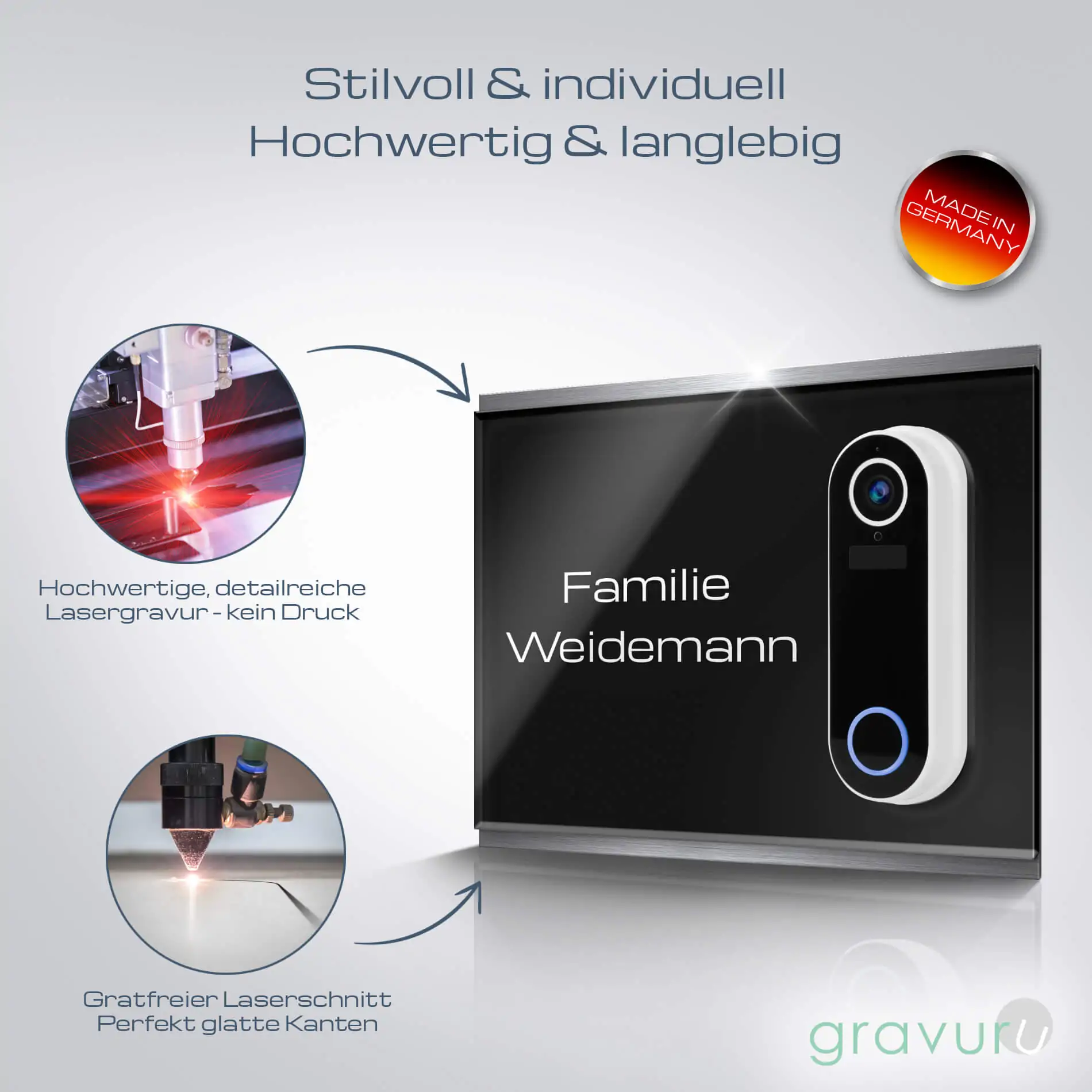 Die Funkklingelschilder aus Edelstahl & Acrylglas werden in unserer hauseigenen Produktionsstätte nach Industriestandard lasergeschnitten und graviert. Die Klingelplatte besticht nicht nur mit ihrer Optik, sondern auch mit ihrer Witterungsbeständigkeit – sie ist beständig, rostet nicht und trotzt Wind und Wetter.