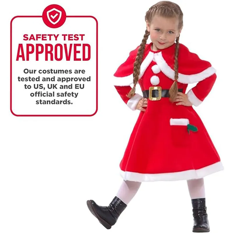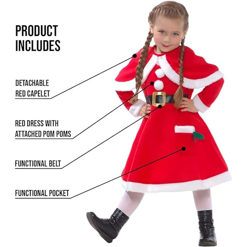 • HOCHWERTIGES MÄDCHEN WEIHNACHTSMANN KOSTÜM: Dieses Produkt beinhaltet ein rotes Kleid mit flauschigen Knöpfen und einer Tasche, einen schwarzen Gürtel und einen roten Kunstpelz Umhang. (Bitte beachten: dieses Outfit enthält nicht die Strumpfhose und Schuhe)