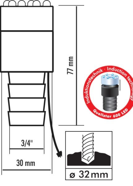 Der Quellstar lässt sich schnell in ein bestehendes Brunnensystem mit einem 3/4″ Schlauch integrieren. Sie benötigen lediglich eine Bohrung im Durchmesser von 32 mm. In Verbindung mit einem optionalen 3fach- oder 5fach-Verteiler können Sie mehrere Geräte an einem 12V-Trafo (Netzteil) anschliessen.