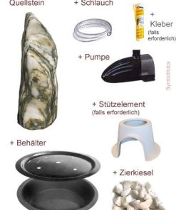 Um den Stein gegen eventuelles Kippen zu sichern ist im Lieferumfang des Quellsteines eine Kartusche (435g) eines Polymerklebers enthalten mit dem man den Quellstein mit dem Untergrund verkleben kann. Zum Auftragen des Klebers wird eine handelsübliche Silikonpistole benötigt, welche nicht im Lieferumfang enthalten ist.