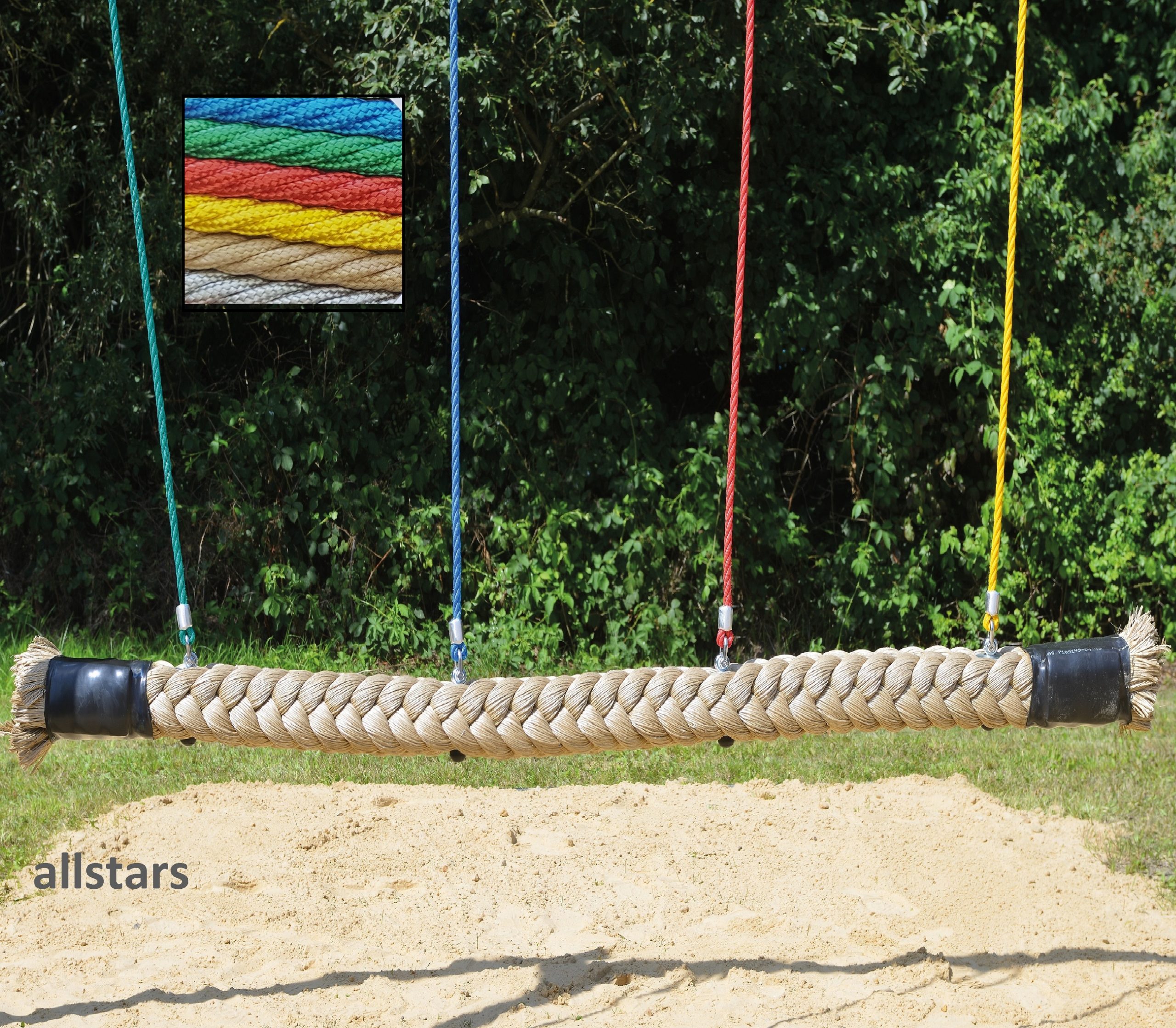 Diese Qualitäts-Tampenschaukel Trio 140 K, gefertigt aus Fendex-Tauwerk, ist sehr langlebig und nahezu unverwüstlich. Sie gehört zum Stabilsten was es zur Zeit am Markt gibt. Der Tampen-Schaukelsitz der Ullmann Seiltechnik GmbH hat eine Kante von 140 mm und bietet mehren Kindern gleichzeitig Platz für viel Spaß. Die Aufhänge-Seile können nach Kundenwunsch in verschiedenen Längen geliefert werden (maximale Aufhängehöhe 300 cm). Die Länge ergibt sich aus der Höhe vom Boden bis zur Unterkante des Kopfbalkens abzüglich 40 cm. Die Schaukelgestelle sollten etwa 3m breit und mindestens 2,2 m (Innenkante Kopfbalken) hoch sein (besser 2,5 m max. 3 m). Die Standpfosten sollten einen Durchmesser von ca. 14-16 cm und die Kopfbalken ca. einen Durchmesser von circa 16 cm haben. Die erforderlichen Schaukelgelenke gehören nicht zum Lieferumfang.