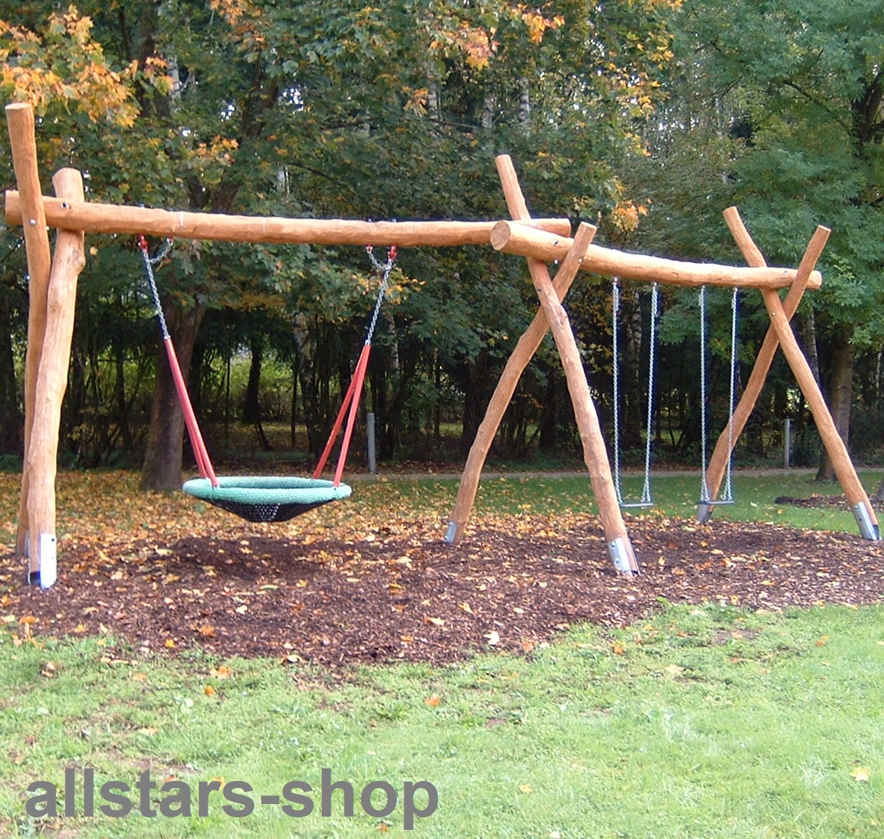 Die urige Winkel-Doppel-Schaukel aus Edelhölzern – Robinie und Eiche naturfarbig – und 2 breiten Kopfbalken für die Ø 145 große Ullmann Vogelnestschaukel und 2 Schaukelsitze, ohne Pfostenschuhe